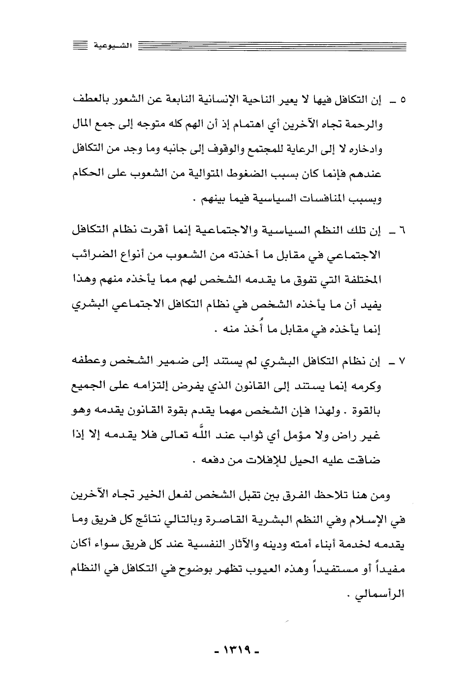 6- إن تلك النظم السياسية والاجتماعية إنما أقرَّت نظام التكافل الاجتماعي في مقابل ما أخذته من الشعوب من أنواع الضرائب المختلفة التي تفوق ما يقدمه الشخص لهم مما يأخذه منهم, وهذا يفيد أن ما يأخذه الشخص في نظام التكافل الاجتماعي البشري إنما يأخذه في مقابل ما أُخِذَ منه.