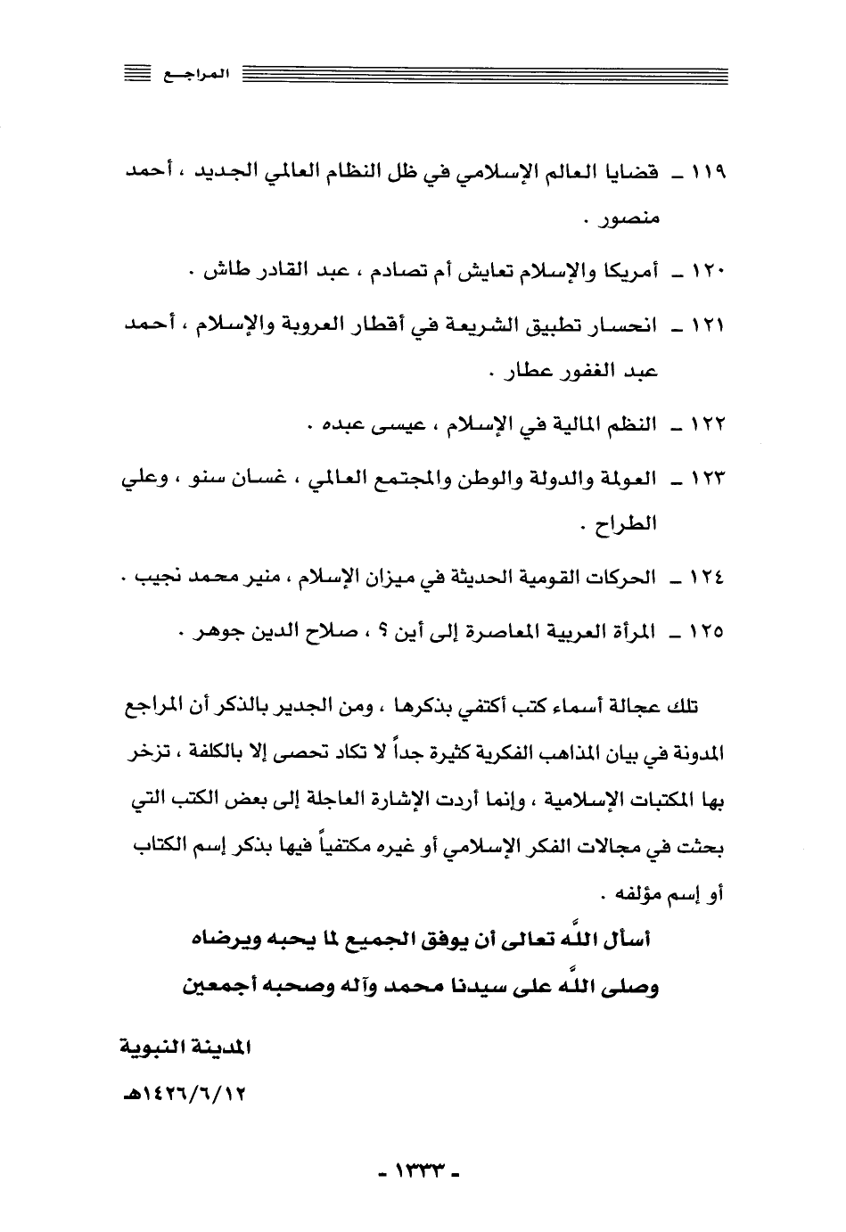 تلك عجالة أسماء كتب أكتفي بذكرها، ومن الجدير بالذكر أن المراجع المدوَّنة في بيان المذاهب الفكرية كثيرة جدًّا لا تكاد تحصى إلّا بالكلفة، تزخر بها المكتبات الإسلامية، وإنما أردت الإشارة العاجلة إلى بعض الكتب التي بحثت في مجالات الفكر الإسلامي أو غيره, مكتفيًا فيها بذكر اسم الكتاب أو اسم مؤلفه.