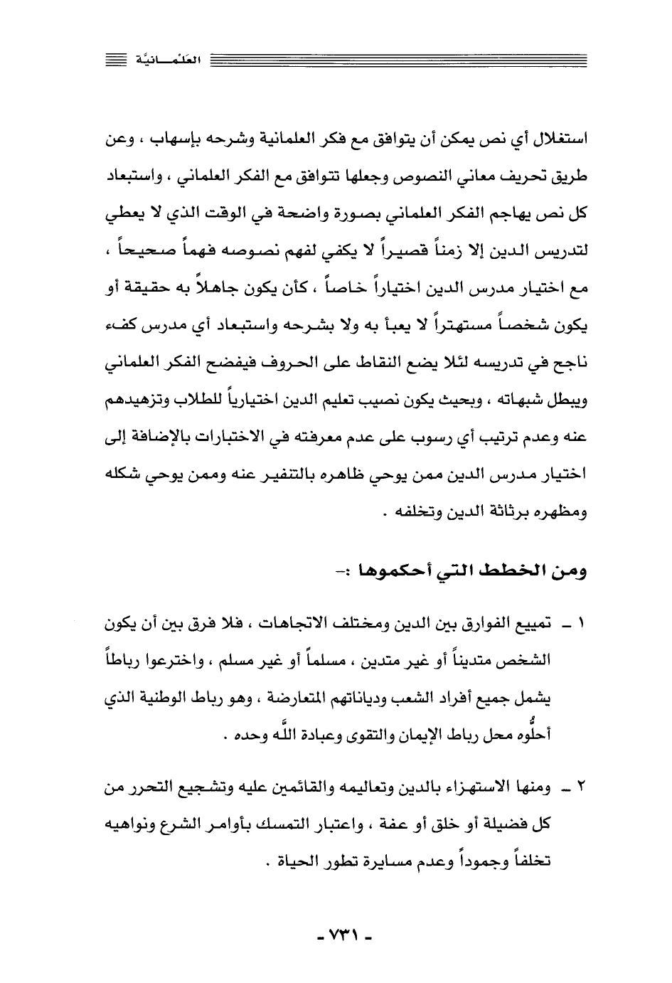 2- ومنها الاستهزاء بالدين وتعاليمه والقائمين عليه, وتشجيع التحرر من كل فضيلة أو خلق أو عفة، واعتبار التمسُّك بأوامر الشرع ونواهيه تخلفًا وجمودًا, وعدم مسايرة تطور الحياة.