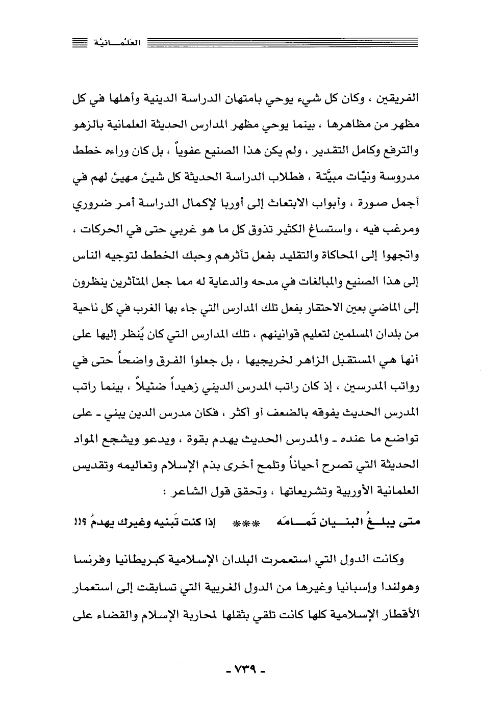 الفريقين، وكان كل شيء يوحي بامتهان الدراسة الدينية وأهلها في كل مظهر من مظاهرها، بينما يوحي مظهر المدارس الحديثة العلمانية بالزهوّ والترفُّع وكامل التقدير، ولم يكن هذا الصنيع عفويًّا، بل كان وراءه خطط مدروسة ونيات مبيَّتة، فطلاب الدراسة الحديثة كل شيء مهيئ لهم في أجمل صورة، وأبواب الابتعاث إلى أوربا لإكمال الدراسة أمرٌ ضروري ومرغب فيه، واستساغ الكثير تذوّق كل ما هو غربي حتى في الحركات، واتَّجهوا إلى المحاكاة والتقليد بفعل تأثُّرهم, وحبك الخطط لتوجيه الناس إلى هذا الصنيع, والمبالغات في مدحه والدعاية له, مما جعل المتأثرين ينظرون إلى الماضي بعين الاحتقار بفعل تلك المدراس التي جاء بها الغرب في كل ناحية من بلدان المسلمين لتعليم قوانينهم، تلك المدراس التي كان ينظر إليها على أنها هي المستقبل الزاهر لخريجيها، بل جعلوا الفرق واضحًا حتى في رواتب المدرسين؛ إذ كان راتب المدرس الديني زهيدًا ضئيلًا، بينما راتب المدرس الحديث يفوقه بالضعف أو أكثر، فكان مدرس الدين يبني -على تواضع ما عنده- والمدرس الحديث يهدم بقوة، ويدعو ويشجع المواد الحديثة التي تصرِّح أحيانًا وتلمح أخرى بذم الإسلام وتعاليمه, وتقديم العلمانية الأوربية وتشريعاتها، وتحقق قول الشاعر: