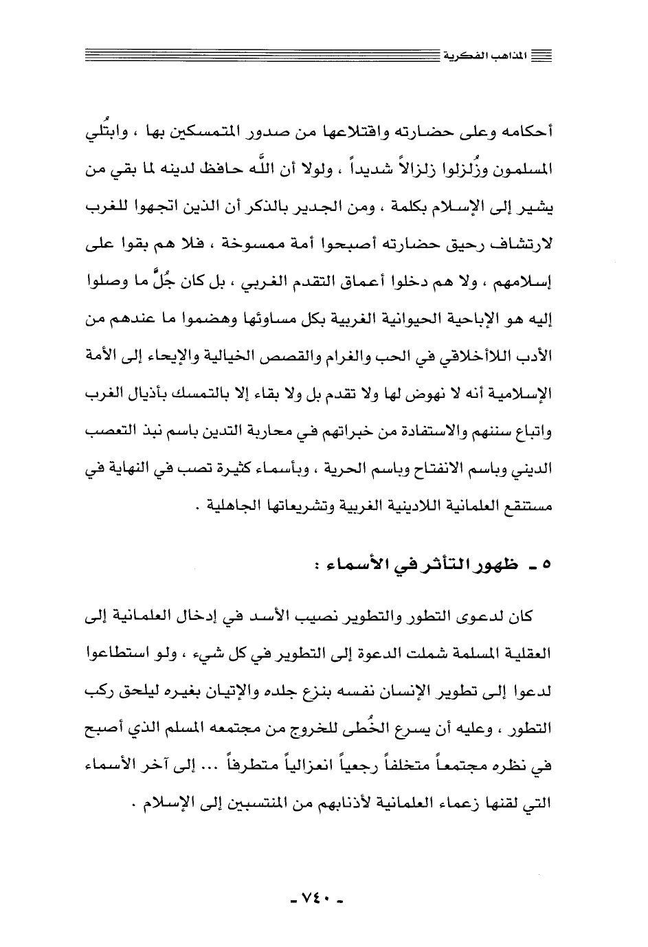 أحكامه, وعلى حضارته, واقتلاعها من صدور المتمسِّكين بها، وابتُلِيَ المسلمون وزلزلوا زلزلًا شديدًا، ولولا أنَّ الله حافظ لدينه لما بقي مَنْ يشير إلى الإسلام بكلمة، ومن الجدير بالذكر أن الذين اتجهوا للغرب لارتشاف رحيق حضارته أصبحوا أمَّة ممسوخة، فلا هم بقوا على إسلامهم، ولا هم دخلوا أعماق التقدُّم الغربي، بل كان جلّ ما وصلوا إليه هو الإباحية الحيوانية الغربية بكل مساوئها, وهضموا ما عندهم من الأدب اللا أخلاقي في الحب والغرام والقصص الخيالية, والإيحاء إلى الأمَّة الإسلامية أنه لا نهوض لها ولا تقدُّم, بل ولا بقاء إلّا بالتمسك بأذيال الغرب, واتباع سننهم, والاستفادة من خبراتهم في محاربة التدين باسم نبذ التعصب الديني, وباسم الانفتاح, وباسم الحرية، وبأسماء كثيرة تصب في النهاية في مستنقع العلمانية اللادينية الغربية, وتشريعاتها الجاهلية.