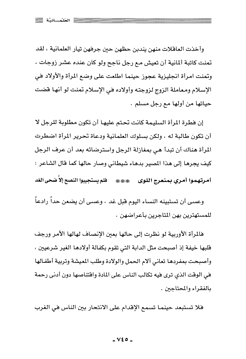 وأخذت العاقلات منهنَّ بندبن حظَّهن حين جرفهنَّ تيار العلمانية، لقد تمنَّت كاتبة ألمانية أن تعيش مع رجل ناجح, ولو كان عنده عشر زوجات، وتمنَّت امرأة إنجليزية عجوز حينما اطَّلعت على وضع المرأة والأولاد في الإسلام, ومعاملة الزوج لزوجته وأولاده في الإسلام, تمنَّت لو أنَّها قضت حياتها من أولها مع رجل مسلم.