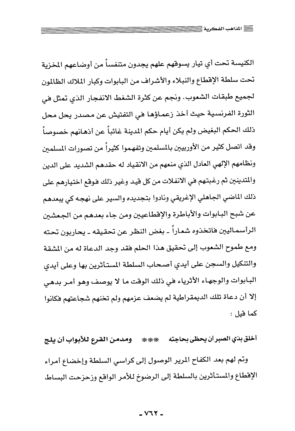 الكنيسة تحت أيّ تيار يسوقهم, علَّهم يجدون متنفسًا من أوضاعهم المخزية تحت سلطة الإقطاع والنبلاء والأشراف من البابوات, وكبار الملاك الظالمون لجميع طبقات الشعوب. ونجم عن كثرة الشغط الانفجار الذي تمثَّل في الثورة الفرنسية؛ حيث أخذ زعماؤها في التفتيش عن مصدر يحلّ محل ذلك الحكم البغيض, ولم يكن أيام حكم المدينة غائبًا عن أذهانهم, خصوصًا وقد اتَّصل كثير من الأوربيين بالمسلمين, وتفهَّموا كثيرًا من تصوارت المسلمين ونظامهم الإلهي العادل, الذي منعهم من الانقياد له حقدهم الشديد على الدين والمتدينين, ثم رغبتهم في الانفلات من كل قيد وغير ذلك, فوقع اختيارهم على ذلك الماضي الجاهلي الإغريقي ونادوا بتجديده والسير على نهجه؛ كي يبعدهم عن شبح البابوات والأباطرة والإقطاعيين ومن جاء بعدهم من الجشعين الرأسماليين, فاتَّخذوه شعارًا -بِغَضِّ النَّظَرِ عن تحقيقه- يحاربون تحته, ومع طموح الشعوب إلى تحقيق هذا الحلم, فقد وجد الدعاة له من المشقَّة والتَّنكيل والسجن على أيدي أصحاب السلطة المستأثرين بها, وعلى أيدي البابوات والوجهاء والأثرياء في ذلك الوقت ما لا يوصف, وهو أمر بدهي, إلّا أنَّ دعاة تلك الديمقراطية لم يضعف عزمهم ولم تخنهم شجاعتهم, فكانوا كما قيل: