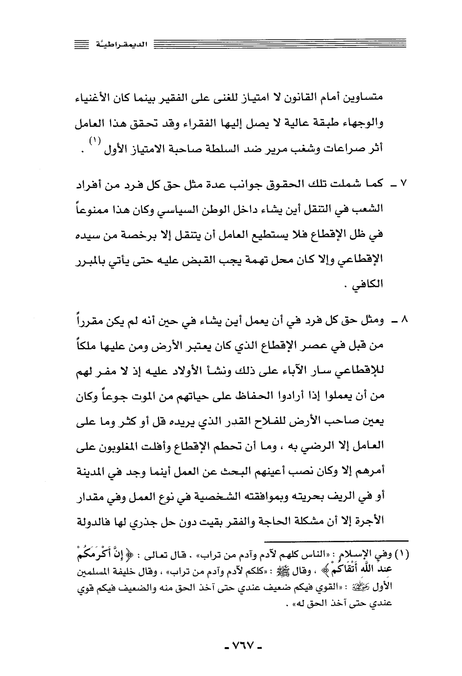 1 وفي الإسلام: "الناس كلهم لآدم وآدم من تراب" , قال تعالى: {إِنَّ أَكْرَمَكُمْ عِنْدَ اللَّهِ أَتْقَاكُمْ} ، وقال -صلى الله عليه سلم: "كلكم لآدم وأدم من تراب"، وقال خليفة المسلمين الأول -رضي الله عنه: "القوي فيكم ضعيف عندي حتى آخذ الحق منه, والضعيف فيكم قوي عندي حتى آخذ الحق له".