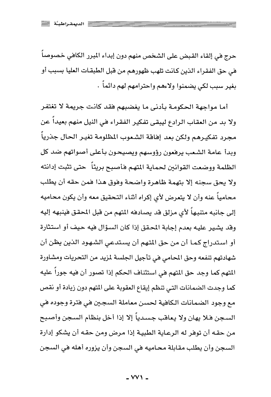 أما مواجهة الحكومة بأدنى ما يغضبهم فقد كانت جريمة لا تغتفر, ولا بُدَّ من العقاب الرادع ليبقى تفكير الفقراء في النيل منهم بعيدًا عن مجرَّد تفكيرهم, ولكن بعد إفاقة الشعوب المظلومة تغير الحال جذريًّا, وبدأ عامَّة الشعب يرفعون رءوسهم ويصيحون بأعلى أصواتهم ضد كل الظملة, ووضعت القوانين لحماية المتهم فأصبح بريئًا حتى تثبت إدانته, ولا يحق سجنه إلّا بتهمة ظاهرة واضحة, وفوق هذا فمن حقه أن يطلب محاميًا عنه, وأن لا يتعرَّض لأيّ إكراه أثناء التحقيق معه, وأن يكون محاميه إلى جانبه متنبهًا لأي مزلق قد يصادفه المتَّهم من قِبَلِ المحقِّقِ فينبهه إليه, وقد يشير عليه بعدم إجابة المحقق إذا كان السؤال فيه حيف أو استثارة أو استدراج, كما أن من حقِّ المتَّهم أن يستدعي الشهود الذين يظن أن شهادتهم تنفعه, وحق المحامي في تأجيل الجلسة لمزيد من التحرِّيات ومشاورة المتَّهم, كما وجد حق المتَّهم في استئناف الحكم إذا تصوّر أن فيه جورًا عليه, كما وجدت الضمانات التي تنظم إيقاع العقوبة على المتَّهم دون زيادة أو نقص, مع وجود الضمانات الكافية لحسن معاملة السجين في فترة وجوده في السجن, فلا يهان ولا يعاقب جسديًّا إلّا إذا أخلَّ بنظام السجن, وأصبح من حقه أن توفَّر له الرعاية الطبية إذا مرض, ومن حقه أن يشكو إدارة السجن, وأن يطلب مقابلة محاميه في السجن, وأن يزروه أهله في السجن