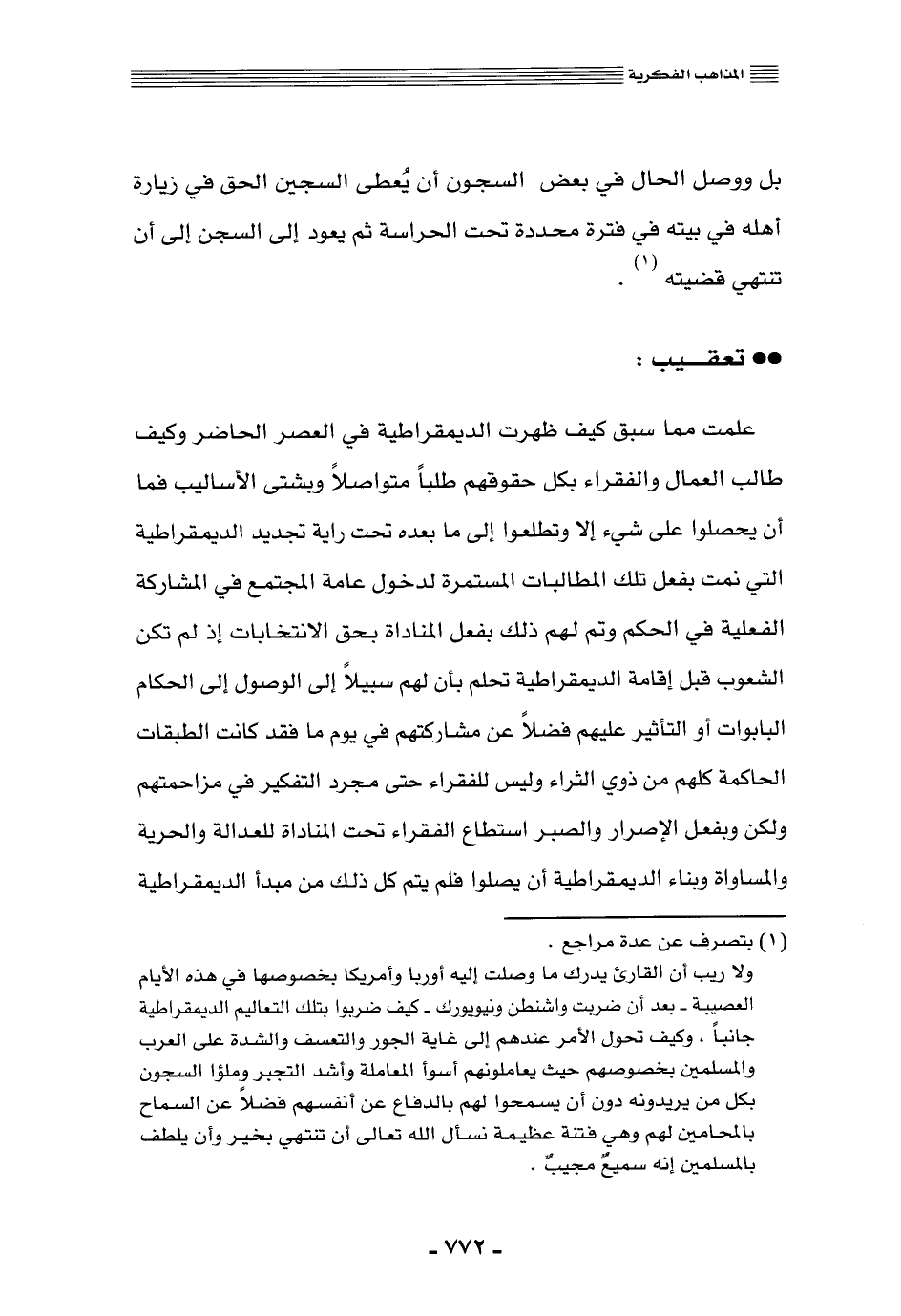 ولا ريب أن القارئ يدرك ما وصلت إليه أوربا وأمريكا بخصوصهما في هذه الأيام العصيبة -بعد أن ضربت واشنطن ونيويورك- كيف ضربوا بتلك التعاليم الديمقراطية جانبًا، وكيف تحوَّل الأمر عندهم إلى غاية الجور والتعسُّف والشدة على العرب والمسلمين بخصوصهم؛ حيث يعاملونهم أسوأ المعاملة وأشد التجبر, وملئوا السجون بكلِّ من يريدونه دون أن يسمحوا لهم بالدفاع عن أنفسهم, فضلًا عن السماح بالمحامين لهم, وهي فتنة عظيمة نسأل الله تعالى أن تنتهي بخير, وأن يلطف بالمسلمين إنه سميع مجيب.