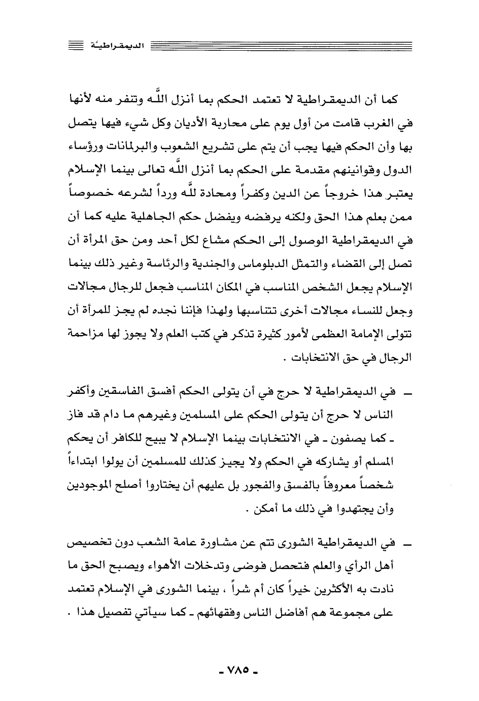 - في الديمقراطية لا حرج في أن يتولّى الحكم أفسق الفاسقين وأكفر الناس, لا حرج أن يتولَّى الحكم على المسلمين وغيرهم ما دام قد فاز -كما يصفون- في الانتخابات, بينما الإسلام لا يبيح للكافر أن يحكم المسلم أو يشاركه في الحكم, ولا يجيز كذلك للمسلمين أن يولّوا ابتداءً شخصًا معروفًا بالفسق والفجور, بل عليهم أن يختاروا أصلح الموجودين, وأن يجتهدوا في ذلك ما أمكن.