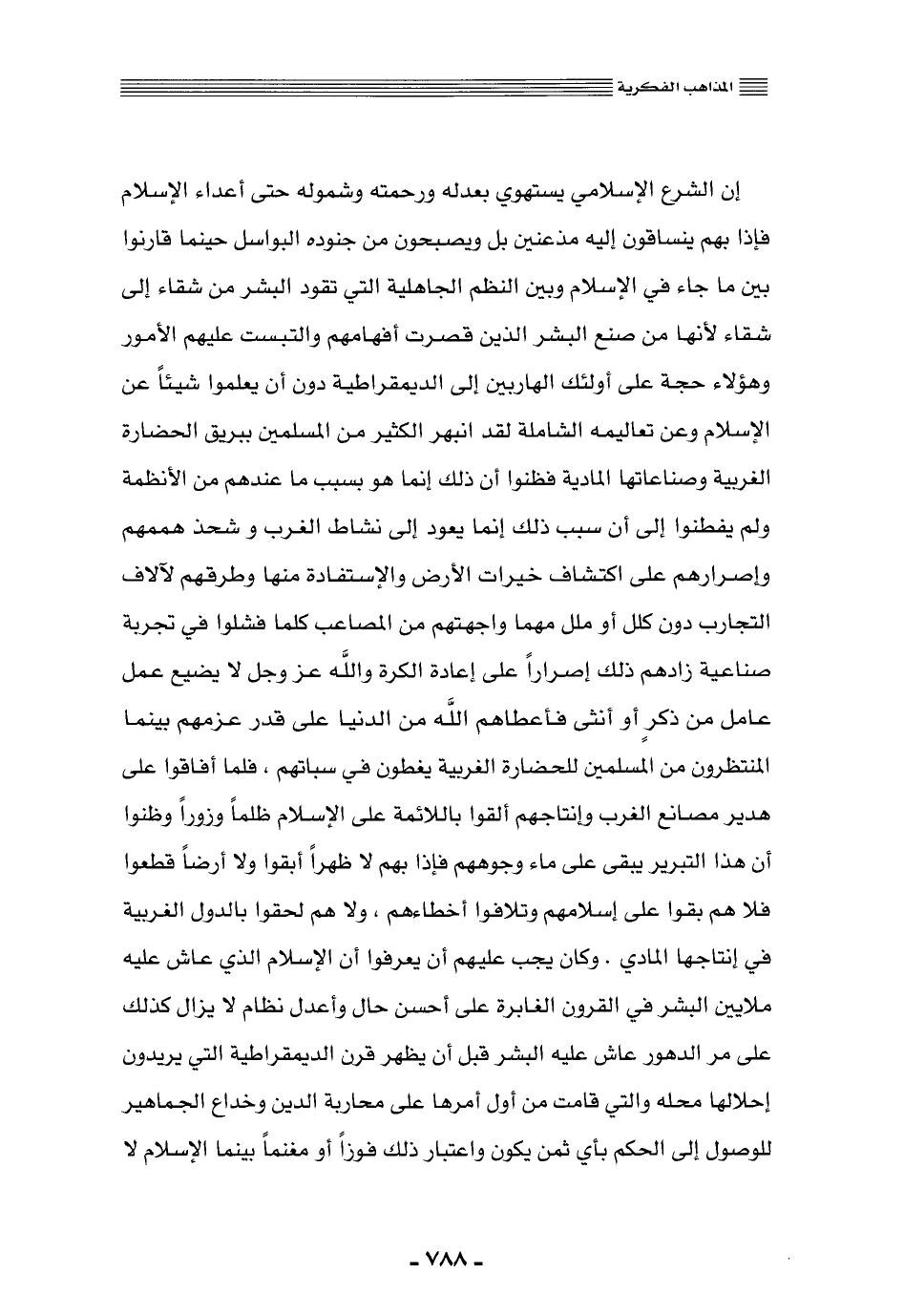 إن الشرع الإسلامي يستهوي بعدله ورحمته وشموله حتى أعداء الإسلام, فإذا بهم ينساقون إليه مذعنين, بل ويصبحون من جنوده البواسل حينما قارنوا بين ما جاء في الإسلام وبين النظم الجاهلية التي تقود البشر من شقاء إلى شقاء؛ لأنها من صنع البشر الذين قصرت أفهامهم, والتبست عليهم الأمور, وهؤلاء حُجَّة على أولئك الهاربين إلى الديمقراطية دون أن يعلموا شيئًا عن الإسلام وعن تعاليمه الشاملة, لقد انبهر الكثير من المسلمين ببريق الحضارة الغربية وصناعاتها المادية, فظنوا أنّ ذلك إنما هو بسبب ما عندهم من الأنظمة, ولم يفطنوا إلى أنَّ سبب ذلك إنما يعود إلى نشاط الغرب وشحذ هممهم وإصرارهم على اكتشاف خيرات الأرض والاستفادة منها, وطرقهم لآلاف التجارب دون كلل أو ملل مهما واجهتهم من المصاعب, كلما فشلوا في تجربة صناعية زادهم ذلك إصرارًا على إعادة الكَرَّة, والله -عز وجل- لا يضيع عمل عاملٍ من ذكر أو أنثى, فأعطاهم الله من الدنيا على قدر عزمهم, بينما المنتظرون من المسلمين للحضارة الغربية يغطُّون في سباتهم، فلمَّا أفاقوا على هدير مصانع الغرب وإنتاجهم ألقوا باللائمة على الإسلام ظلمًا وزورًا, وظنُّوا أن هذا التبرير يبقي على ماء وجوههم, فإذا بهم لا ظهرًا أبقوا ولا أرضًا قطعوا, فلا هم بقوا على إسلامهم وتلافوا أخطاءهم، ولا هم لحقوا بالدول الغربية في إنتاجها المادي, وكان يجب عليهم أن يعرفوا أن الإسلام الذي عاش عليه ملايين البشر في القرون الغابرة على أحسن حال وأعدل نظام لا يزال كذلك على مَرِّ الدهور عاش عليه البشر قبل أن يظهر قرن الديمقراطية التي يريدون إحلالها محله, والتي قامت من أوّل أمرها على محاربة الدين وخداع الجماهير للوصول إلى الحكم بأي ثمن يكون, واعتبار ذلك فوزًا أو مغنمًا, بينما الإسلام لا