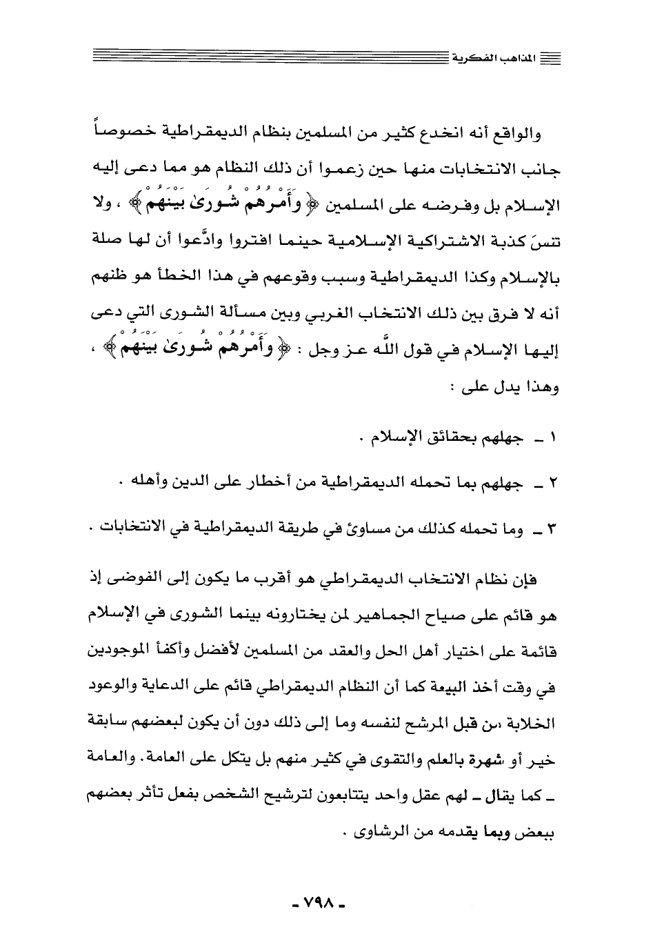 والواقع أنه انخدع كثير من المسلمين بنظام الديمقراطية, خصوصًا جانب الانتخابات منها, حين زعموا أن ذلك النظام هو مما دعى إليه الإسلام, بل وفرضه على المسلمين {وَأَمْرُهُمْ شُورَى بَيْنَهُمْ} ، ولا تنس كذبة الاشتراكية الإسلامية حينما افتروا وادَّعَوْا أن لها صلة بالإسلام وكذا الديمقراطية, وسبب وقوعهم في هذا الخطأ هو ظنِّهم أنه لا فرق بين الانتخاب الغربي وبين مسألة الشورى التي دعى إليها الإسلام في قول الله -عز وجل: {وَأَمْرُهُمْ شُورَى بَيْنَهُمْ} ، وهذا يدل على:
