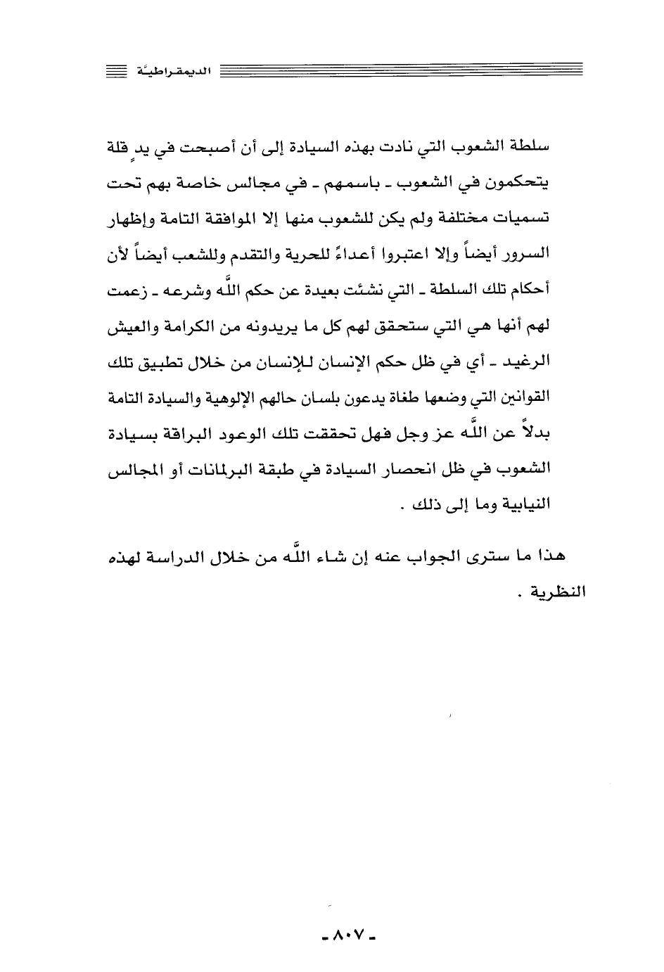 سلطة الشعوب التي نادت بهذه السيادة إلى أن أصبحت في يد قلة يتحكَّمون في الشعوب -باسمهم- في مجالس خاصة بهم تحت تسميات مختلفة, ولم يكن للشعوب منها إلّا الموافقة التامَّة وإظهار السرور أيضًا, وإلا اعتبروا أعداءً للحرية والتقدم وللشعب أيضًا؛ لأن أحكام تلك السلطة التي نشأت بعيدة عن حكم الله وشرعه -زعمت لهم أنها هي التي ستحقق لهم كل ما يريدونه من الكرامة والعيش الرغيد- أي: في ظل حكم الإنسان للإنسان من خلال تطبيق تلك القوانين التي وضعها طغاة يدعون بلسان حالهم الإلوهية والسيادة التامّة بدلّا عن الله -عز وجل, فهل تحققت تلك الوعود البراقة بسيادة الشعوب في ظل انحصار السيادة في طبقة البرلمانات أو المجالس النيابية وما إلى ذلك.