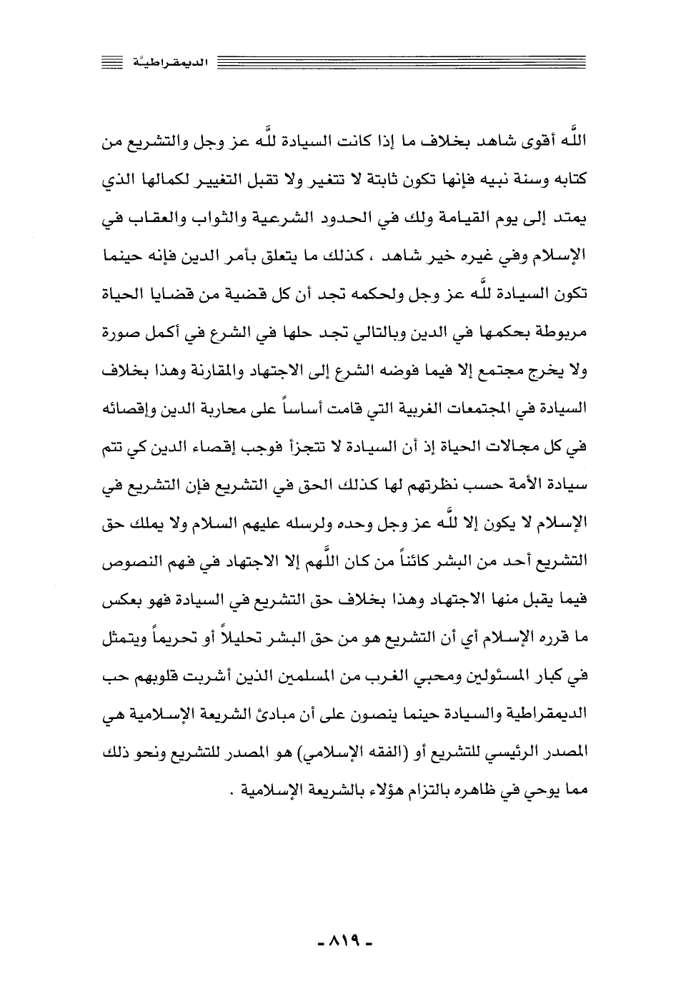 الله أقوى شاهد, بخلاف ما إذا كانت السيادة لله -عز وجل, والتشريع من كتابه وسنة نبيه, فإنها تكون ثابتة لا تتغيِّر ولا تقبل التغيير؛ لكمالها الذي يمتد إلى يوم القيامة, ولك في الحدود الشرعية والثواب والعقاب في الإسلام وفي غيره خير شاهد، كذلك ما يتعلق بأمر الدين فإنه حينما تكون السيادة لله -عز وجل- ولحكمه, تجد أ، كل قضية من قضايا الحياة مربوطة بحكمها في الدين, وبالتالي تجد حلها في الشرع في أكمل صورة, ولا يخرج مجتمع إلّا فيما فوَّضه الشرع إلى الاجتهاد والمقارنة, وهذا بخلاف السيادة في المجتمعات الغربية التي قامت أساسًا على محاربة الدين وإقصائه في كل مجالات الحياة؛ إذ أن السيادة لا تتجزَّأ, فوجب أقصاء الدين كي تتم سيادة الأمة حسب نظرتهم لها, كذلك الحق في التشريع, فإن التشريع في الإسلام لا يكون إلا لله -عز وجل- وحده ولرسله -عليهم السلام, ولا يملك حق التشريع أحد من البشر كائنًا مَنْ كان, اللهم إلّا الاجتهاد في فهم النصوص فيما يقبل منها الاجتهاد, وهذا بخلاف حق التشريع في السيادة, فهو بعكس ما قرَّره الإسلام, أي: إن التشريع هو من حق البشر تحليلًا أو تحريمًا, ويتمثَّل في كبار المسئولين ومحبي الغرب من المسلمين الذين أشربت قلوبهم حب الديمقراطية والسيادة, حينما ينصون على أن مبادئ الشريعة الإسلامية هي المصدر الرئيسي للتشريع, أو "الفقه الإسلامي" هو المصدر للتشريع, ونحو ذلك مما يوحي في ظاهره بالتزام هؤلاء بالشريعة الإسلامية.