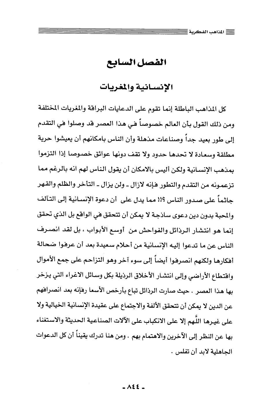 كل المذاهب الباطلة إنما تقوم على الدعايات البراقة والمغريات المختلفة, ومن ذلك القول بأن العالم خصوصًا في هذا العصر قد وصلوا في التقدُّم إلى طور بعيد جدًّا, وصناعات مذهلة, وأن الناس بإمكانهم أن يعيشوا في حرية مطلقة وسعادة لا تحدها حدود ولا تقف دونها عوائق, خصوصًا إذا التزموا بمذهب الإنسانية, ولكن أليس بالإمكان أن يقول الناس لهم: إنه بالرغم مما تزعمونه من التقدم والتطور فإنه لا زال -ولن يزال- التأخر والظلم والقهر جاثمًا على صدور الناس. مما يدل على أن دعوة الإنسانية إلى التآلف والمحبة بدون دين دعوى ساذجة لا يمكن أن تتحقق في الواقع, بل الذي تحقق إنما هو انتشار الرذائل والفواحش من أوسع الأبواب، بل لقد انصرف الناس عن ما تدعوا إليه الإنسانية من أحلام سعيدة بعد أن عرفوا ضحالة أفكارها, ولكنهم انصرفوا أيضًا إلى سوء آخر وهو التزاحم على جمع الأموال واقتطاع الأراضي, وإلى انتشار الأخلاق الرذيلة بكلِّ وسائل الإغراء التي يزخر بها هذا العصر. حيث صارت الرذائل تباع بأرخص الأسعار, فإنه بعد انصرافهم عن الدين لا يمكن أن تتحقق الألفة والاجتماع على عقيدة الإنسانية الخيالية, ولا على غيرها, اللهم إلّا على الانكباب على الآلات الصناعية الحديثة, والاستغناء بها عن النظر إلى الآخرين والاهتمام بهم، ومن هنا تدرك يقينًا ان كل الدعوات الجاهلية لا بُدَّ أن تفلس.