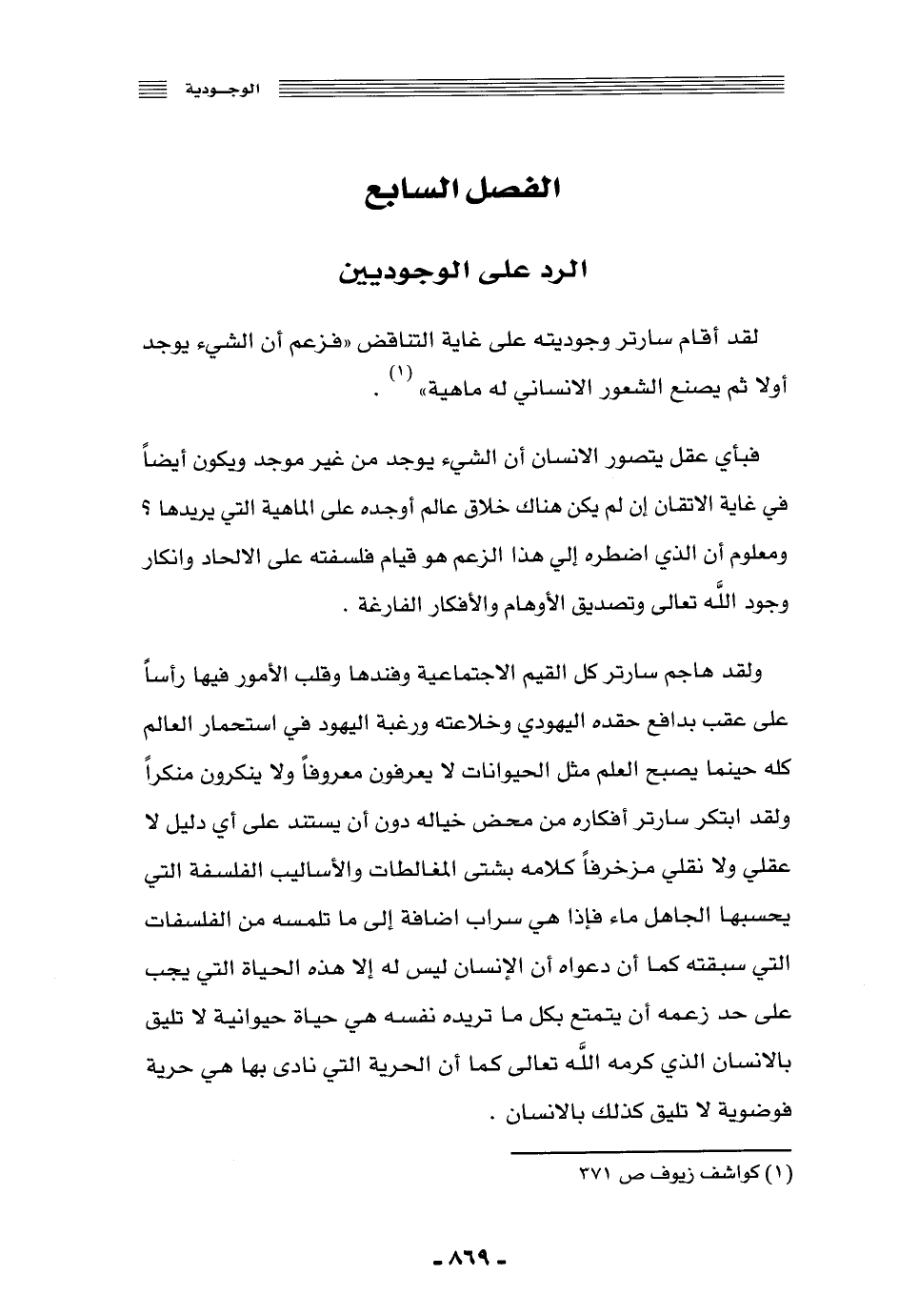 ولقد هاجم سارتر كل القيم الاجتماعية وفنَّدها وقلب الأمور فيها رأسًا على عقب, بدافع حقده اليهودي وخلاعته ورغبة اليهود في استحمار العالم كله, حينما يصبح العالم مثل الحيوانات لا يعرفون معروفًا ولا ينكرون منكرًا, ولقد ابتكر سارتر أفكاره من محض خياله دون أن يستند على أيّ دليل لا عقلي ولا نقلي, مزخْرِفًا كلامه بشتَّى المغالطات والأساليب الفلسفة التي يحسبها الجاهل ماءً, فإذا هي سراب أضافه إلى ما تلمَّسه من الفلسفات التي سبقته, كما أن دعواه أن الإنسان ليس له إلّا هذه الحياة التي يجب على حدِّ زعمه أن يتمتَّع بكل ما تريده نفسه, هي حياة حيوانية لا تليق بالإنسان الذي كرمه الله تعالى, كما أن الحرية التي نادى بها هي حرية فوضوية لا تليق كذلك بالإنسان.