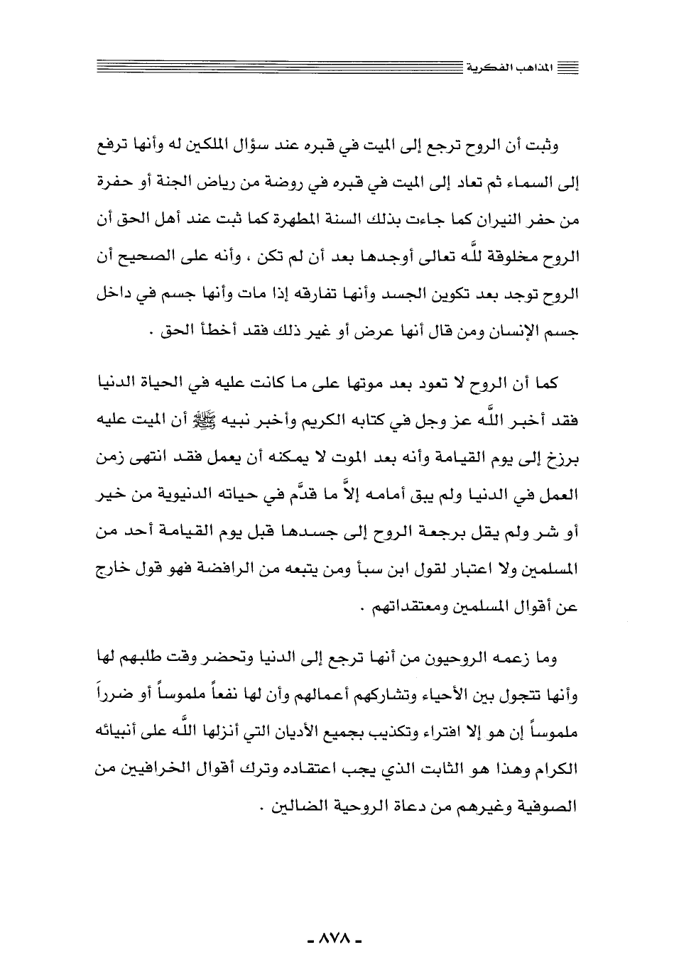 وثبت أن الروح ترجع إلى الميت في قبره عند سؤال الملكين له, وأنها ترفع إلى السماء ثم تعاد إلى الميت في قبره, في روضة من رياض الجنة أو حفرة من حفر النيران, كما جاءت بذلك السنة المطهرة, كما ثبت عند أهل الحق أن الروح مخلوقة لله تعالى, أوجدها بعد أن لم تكن، وأنه على الصحيح أن الروح توجد بعد تكوين الجسد, وأنها تفارقه إذا مات, وأنها جسم في داخل جسم الإنسان, ومن قال أنها عَرَض أو غير ذلك فقد أخطأ الحق.