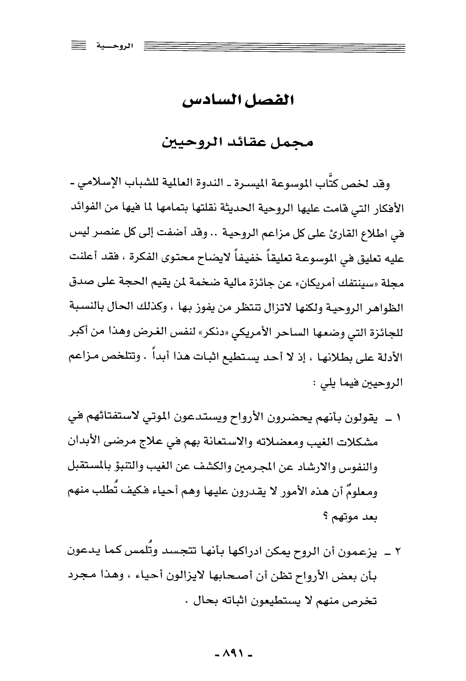وقد لخَّص كتاب الموسوعة الميسرة -الندوة العالمية للشباب الإسلامي- الأفكار التي قامت عليها الروحية الحديثة, نقلتها بتمامها لما فيها من الفوائد في اطّلاع القارئ على كل مزاعم الروحية.. وقد أضفت إلى كلّ عنصر ليس عليه تعليق في الموسوعة تعليقًا خفيفًا لإيضاح محتوى الفكرة، فقد أعلنت مجلة "سينتفك أمريكان" عن جائزة مالية ضخمة لمن يقيم الحجَّة على صدق الظواهر الروحية, ولكنها لا تزال تنتظر من يفوز بها، وكذلك الحال بالنسبة للجائزة التي وضعها الساحر الأمريكي "دنكر" لنفس الغرض, وهذا من أكبر الأدلة على بطلانها؛ إذ لا يستطيع إثبات هذا أبدًا، وتتلخَّص مزاعم الروحيين فيما يلي: