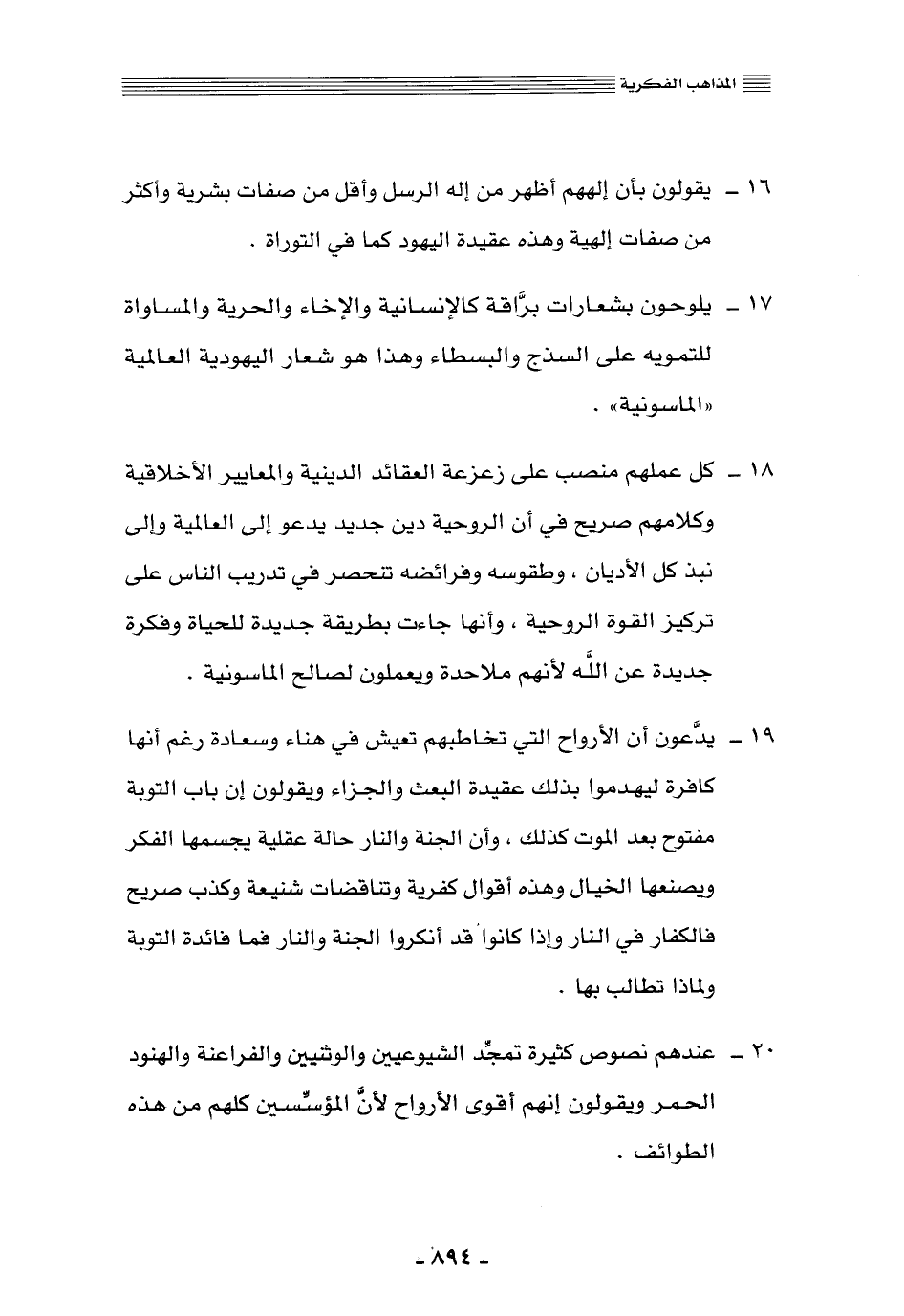 18- كل عملهم منصَبٌّ على زعزعة العقائد الدينية والمعايير الأخلاقية, وكلامهم صريح في أنَّ الروحية دين جديد يدعو إلى العالمية وإلى نبذ كل الأديان، وطقوسه وفرائضه تنحصر في تدريب الناس على تركيز القوة الروحية، وأنَّها جاءت بطريقة جديدة للحياة, وفكرة جديدة عن الله؛ لأنهم ملاحدة ويعملون لصالح الماسونية.