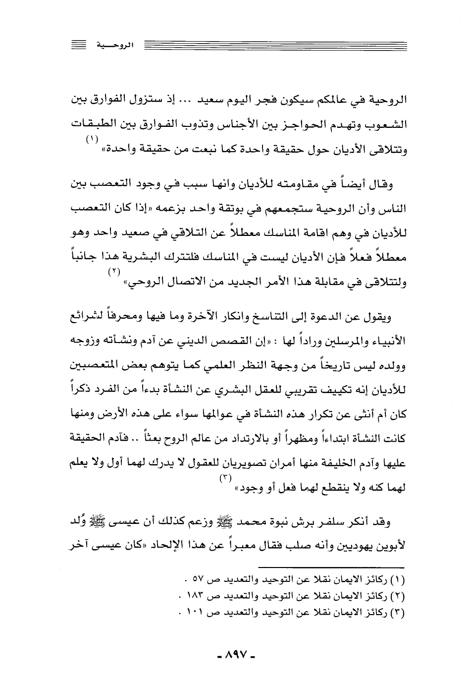 وقال أيضًا في مقاومته للأديان وأنها سبب في وجود التعصب بين الناس, وأن الروحية ستجمعهم في بوتقة واحد بزعمه: "إذا كان التعصُّب للأديان في وهم إقامة المناسك معطّلًا عن التلاقي في صعيد واحد, وهو معطلٌ فعلًا, فإن الأديان ليست في المناسك, فلتترك البشرية هذا جانبًا ولتتلاقى في مقابلة هذا الأمر الجديد من الاتصال الروحي"2.
