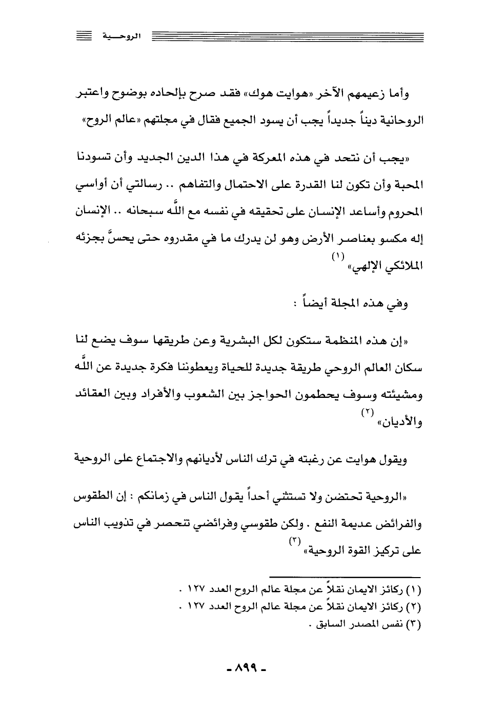 وأما زعيمهم الآخر "هوايت هوك" فقد صرَّح بإلحاده بوضوح, واعتبر الروحانية دينًا جديدًا يجب أن يسود الجميع, فقال في مجلتهم "عالم الروح": "يجب أن نتَّحد في هذه المعركة في هذا الدين الجديد, وأن تسودنا المحبَّة, وأن تكون لنا القدرة على الاحتمال والتفاهم.. رسالتي أن أواسي المحروم وأساعد الإنسان على تحقيقه في نفسه مع الله سبحانه ... الإنسان إله مكسوّ بعناصر الأرض, وهو لن يدرك ما في مقدوره حتى يحسّ بجزئه الملائكي الإلهي"1.