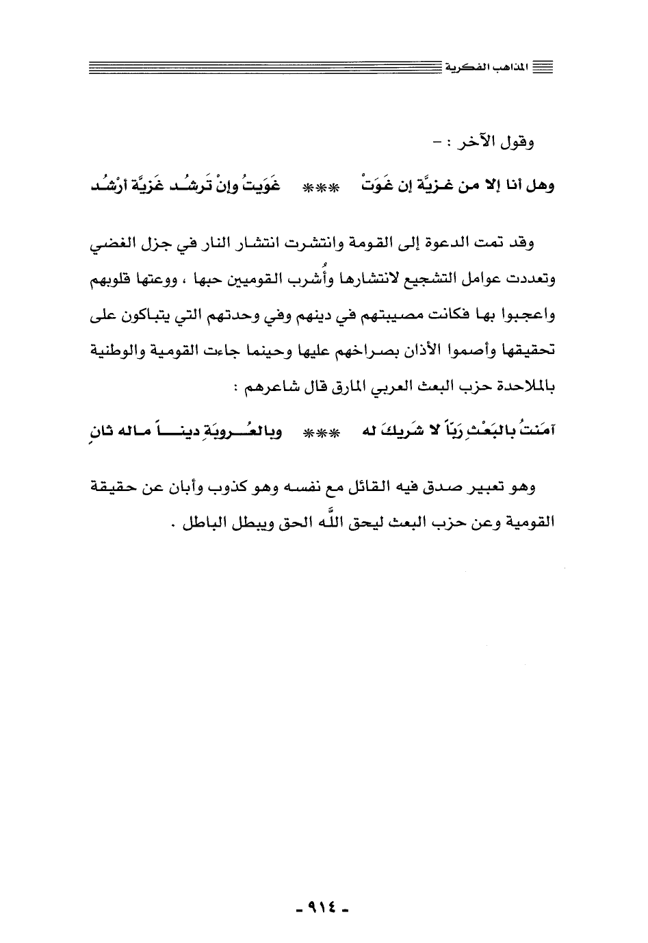 وقد تمت الدعوة إلى القومية وانتشرت انتشار النار في جزل الغضي, وتعدَّدت عوامل التشجيع لانتشارها, وأشرب القوميين حبها، ووعتها قلوبهم, وأعجبوا بها, فكانت مصيبتهم في دينهم وفي وحدتهم التي يتباكون على تحقيقها, وأصمَّوا الآذان بصراخهم عليها, وحينما جاءت القومية والوطنية بالملاحدة حزب البعث العربي المارق, قال شاعرهم: