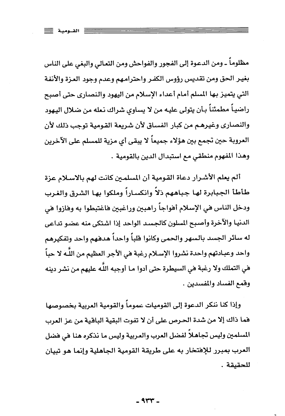 مظلومًا- ومن الدعوة إلى الفجور والفواحش, ومن التعالي والبغي على الناس بغير الحق, ومن تقديس رءوس الكفر واحترامهم, وعدم وجود العزَّة والأنفة التي يتميّز بها المسلم أمام أعداء الإسلام من اليهود والنصارى, حتى أصبح راضيًا مطمئنًا بأن يتولّى عليه من لا يساوي شراك نعله من ضلال اليهود والنصارى وغيرهم من كبار الفساق؛ لأنَّ شريعة القومية توجب ذلك لأنَّ العروبة حين تجمع بين هؤلاء جميعًا لا يبقى أيّ مزية للمسلم على الآخرين, وهذا المفهوم منطقي مع استبدال الدين بالقومية.