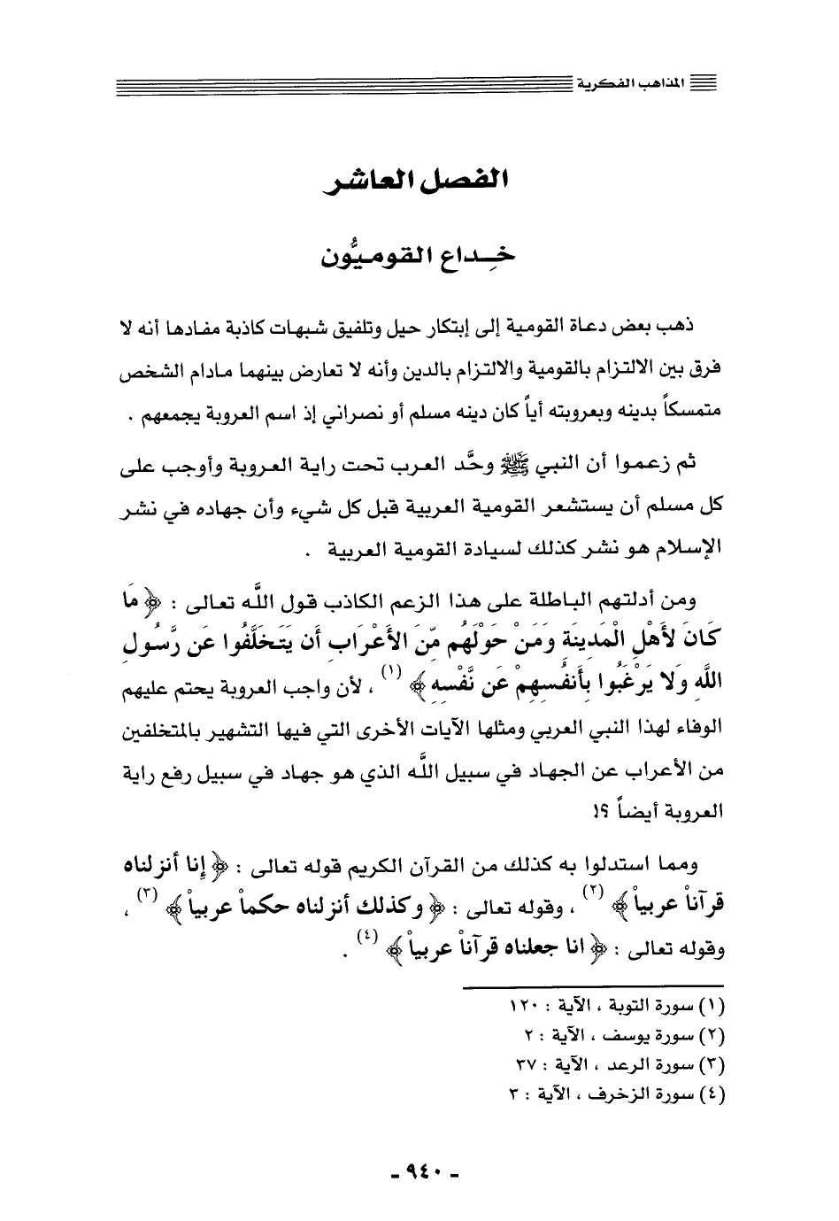ومن أدلتهم الباطلة على هذا الزعم الكاذب قول الله تعالى: {مَا كَانَ لِأَهْلِ الْمَدِينَةِ وَمَنْ حَوْلَهُمْ مِنَ الْأَعْرَابِ أَنْ يَتَخَلَّفُوا عَنْ رَسُولِ اللَّهِ وَلَا يَرْغَبُوا بِأَنْفُسِهِمْ عَنْ نَفْسِهِ} 1؛ لأن واجب العروبة يحتم عليهم الوفاء لهذا النبي العربي, ومثلها الآيات الأخرى التي فيها التشهير بالمتخلفين من الأعراب عن الجهاد في سبيل الله, الذي هو جهاد في سبيل رفع راية العروبة أيضًا.