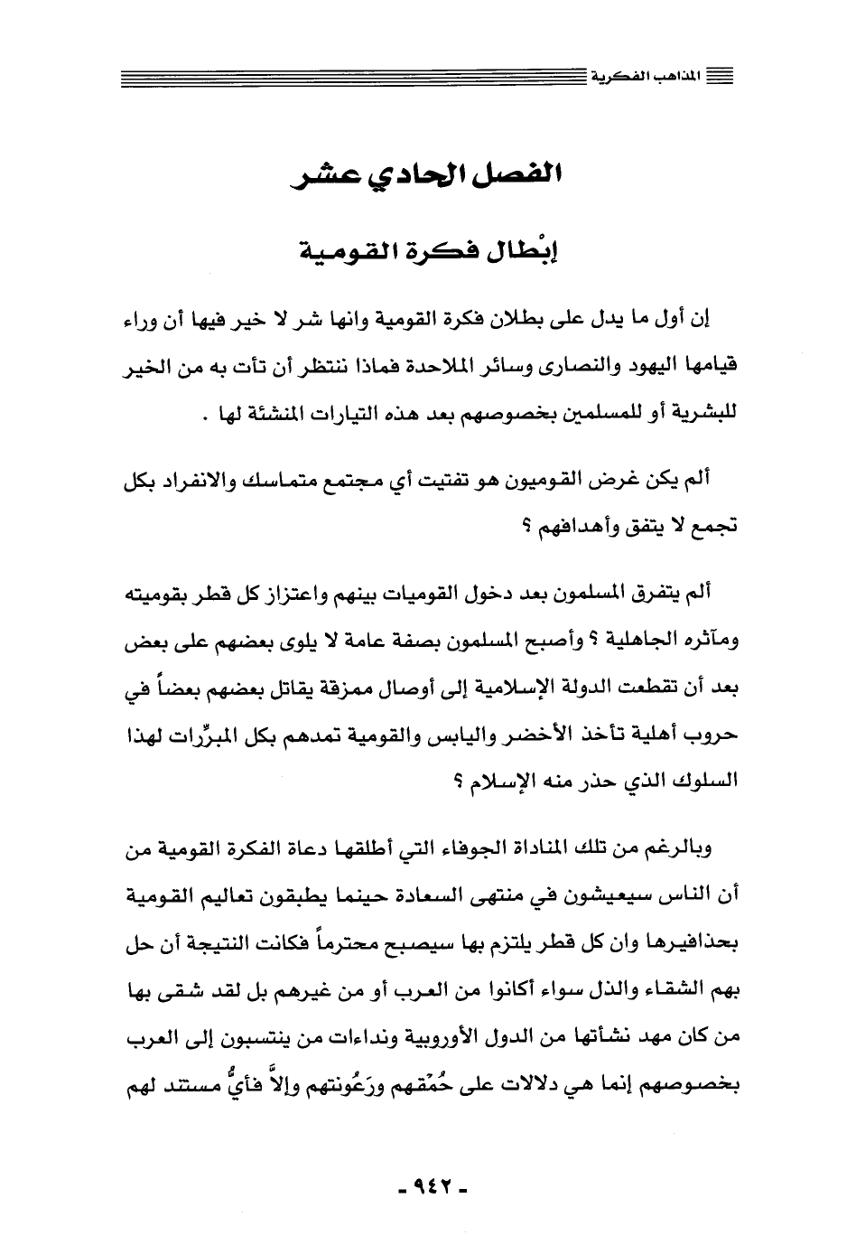 ألم يتفرَّق المسلمون بعد دخول القوميات بينهم, واعتزاز كل قطر بقوميته ومآثره الجاهلية؟ وأصبح المسلمون بصفة عامَّة لا يلوي بعضهم على بعض, بعد أن تقطَّعت الدولة الإسلامية إلى أوصال ممزَّقة يقاتل بعضهم بعضًا في حروب أهلية تأخذ الأخضر واليابس, والقومية تمدُّهم بكل المبررات لهذا السلوك الذي حذَّر منه الإسلام؟