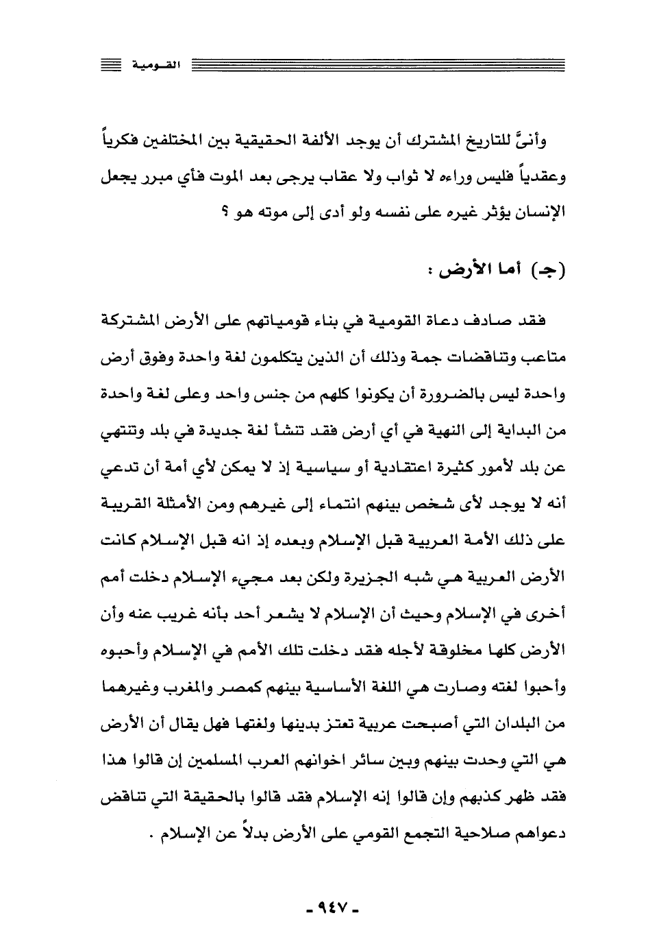 فقد صادف دعاة القومية في بناء قومياتهم على الأرض المشتركة متاعب وتناقضات جمَّة, وذلك أن الذين يتكلمون لغة واحدة وفوق أرض واحدة ليس بالضرورة أن يكونوا كلهم من جنس واحد وعلى لغة واحدة من البداية إلى النهاية, في أيّ أرض, فقد تنشأ لغة جديدة في بلد وتنتهي عن بلد لأمور كثيرة اعتقادية أو سياسية؛ إذ لا يمكن لأي أمَّة أن تدَّعي أنه لا يوجد لأيّ شخص بينهم انتماء إلى غيرهم, ومن الأمثلة القريبة على ذلك الأمة العربية قبل الإسلام وبعده؛ إذ إنه قبل الإسلام كانت الأرض العربية هي شبه الجزيرة, ولكن بعد مجيء الإسلام دخلت أمم أخرى في الإسلام؛ وحيث إن الإسلام لا يشعر أحد بأنه غريب عنه, وأن الأرض كلها مخلوقة لأجله, فقد دخلت تلك الأمم في الإسلام وأحبوه وأحبوا لغته, وصارت هي اللغة الأساسية بينهم؛ كمصر والمغرب وغيرهما من البلدان التي أصبحت عربية تعتز بدينها ولغتها, فهل يقال: إن الأرض هي التي وحَّدت بينهم وبين سائر إخوانهم العرب المسلمين, إن قالوا هذا فقد ظهر كذبهم، وإن قالوا: إنه الإسلام, فقد قالوا بالحقيقة التي تناقض دعواهم صلاحية التجمع القومي على الأرض بدلًا عن الإسلام.