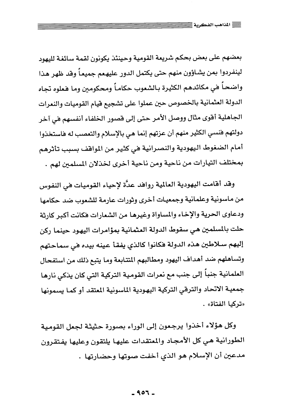 بعضهم على بعض بحكم شريعة القومية, وحينئذ يكونوا لقمة سائغة لليهود؛ لينفردوا بمن يشاءون منهم حتى يكتمل الدور عليهم جميعًا, وقد ظهر هذا واضحًا في مكائدهم الكثيرة بالشعوب حكامًا ومحكومين, وما فعلوه تجاه الدولة العثمانية بالخصوص حين عملوا على تشجيع قيام القوميات والنعرات الجاهلية أقوى مثال, ووصل الأمر حتَّى إلى قصور الخلفاء أنفسهم في آخر دولتهم, فنسي الكثير منهم أن عزَّتهم إنما هي بالإسلام والتعصُّب له, فاستخذوا أمام الضغوط اليهودية والنصرانية في كثير من المواقف بسبب تأثرهم بمختلف التيارات من ناحية, ومن ناحية أخرى لخذلان المسلمين لهم.