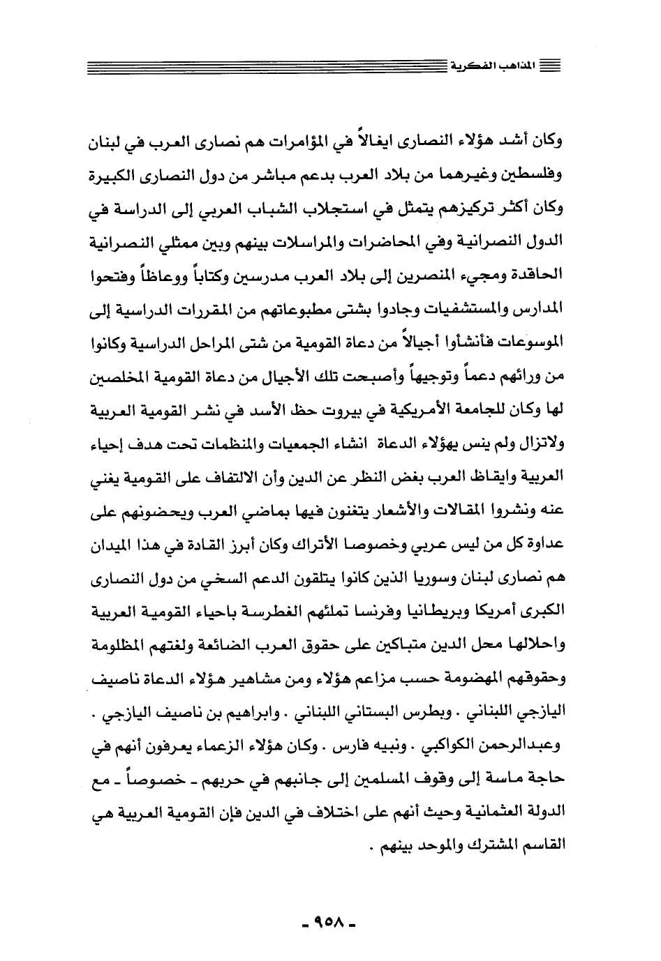 وكان أشد هؤلاء النصارى إيغالًا في المؤامرات هم نصارى العرب في لبنان وفلسطين, وغيرها من بلاد العرب, بدعم مباشر من دول النصارى الكبيرة, وكان أكثر تركيزهم يتمثّل في استجلاب الشباب العربي إلى الدراسة في الدول النصرانية, وفي المحاضرات والمراسلات بينهم وبين ممثّلي النصرانية الحاقدة ومجيء المنصِّرين إلى بلاد العرب مدرسين وكُتَّابا ووعَّاظًا, وفتحوا المدراس والمستشفيات, وجادوا بشتَّى مطبوعاتهم من المقررات الدراسية إلى الموسوعات, فأنشأوا أجيالًا من دعاة القومية من شتَّى المراحل الدراسية, وكانوا من ورائهم دعمًا وتوجيهًا, وأصبحت تلك الأجيال من دعاة القومية المخلصين لها, وكان للجامعة الأمريكية في بيروت حظّ الأسد في نشر القومية العربية ولا تزال, ولم ينس هؤلاء الدعاة إنشاء الجمعيات والمنظَّمات تحت هدف إحياء العربية وإيقاظ العرب بغضِّ النظر عن الدين, وأنَّ الالتفاف على القومية يغني عنه, ونشروا المقالات والأشعار يتغنَّون فيها بماضي العرب, ويحضونهم على عداة كل من ليس عربي, وخصوصًا الأتراك, وكان أبرز القادة في هذا الميدان هم نصارى لبنان وسوريا الذين كانوا يتلقَّون الدعم السخيّ من دول النصارى الكبرى أمريكا وبريطانيا وفرنسا, تملؤهم الغطرسة بإحياء القومية العربية وإحلالها محل الدين, متباكين على حقوق العرب الضائعة ولغتهم المظلومة وحقوقهم المهضمومة -حسب مزاعم هؤلاء, ومن مشاهير هؤلاء الدعاة ناصيف اليازجي اللبناني، وبطرس البستاني اللبناني، وإبراهيم بن ناصيف اليازجي، وعبد الرحمن الكواكبي، ونبيه فارس، وكان هؤلاء الزعماء يعرفون أنهم في حاجة ماسَّة إلى وقوف المسلمين إلى جانبهم في حربهم -خصوصًا- مع الدولة العثمانية, وحيث إنهم على اختلاف في الدين فإنَّ القومية العربية هي القاسم المشترك والموحّد بينهم.