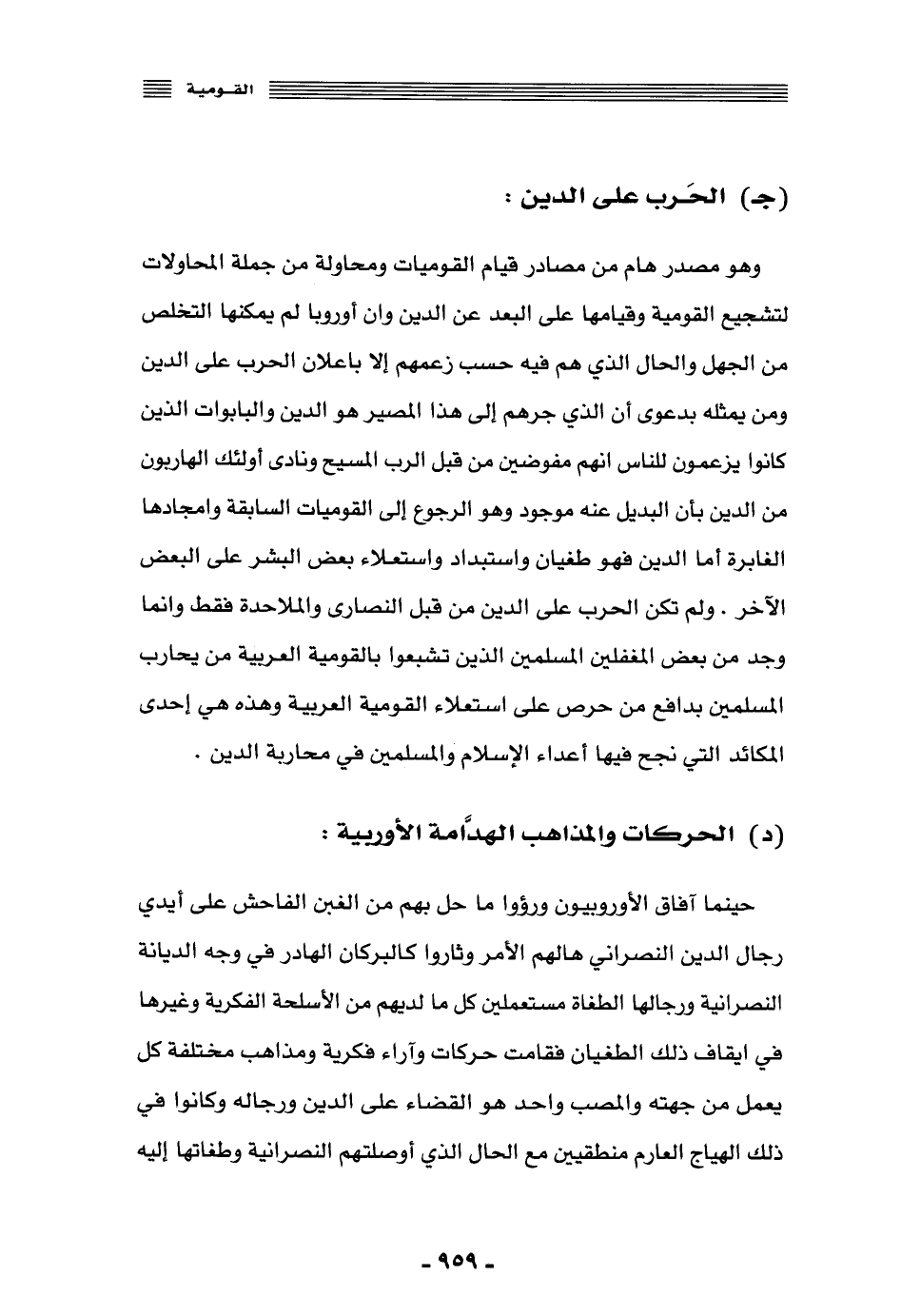 وهو مصدر هامّ من مصادر قيام القوميات, ومحاولة من جملة المحاولات لتشجيع القومية وقيامها على البعد عن الدين, وأن أوروبا لم يمكنها التخلّص من الجهل والحال الذي هم فيه -حسب زعمهم- إلّا بإعلان الحرب على الدين ومن يمثله, بدعوى أن الذي جرَّهم إلى هذا المصير هو الدين والبابوت الذين كانوا يزعمون للناس أنهم مفوضون من قِبَلِ الربّ المسيح, ونادى أولئك الهاربون من الدين بأن البديل عنه موجود, وهو الرجوع إلى القوميات السابقة وأمجادها الغابرة, أما الدين فهو طغيان واستبداد واستعلاء بعض البشر على البعض الآخر, ولم تكن الحرب على الدين من قِبَلِ النصارى والملاحدة فقط, وإنما جدَّ من بعض المغفَّلين المسلمين الذين تشبَّعوا بالقومية العربية من يحارب المسلمين بدافع من حرص على استعلاء القومية العربية, وهذه هي إحدى المكائد التي نجح فيها أعداء الإسلام والمسلمين في محاربة الدين.