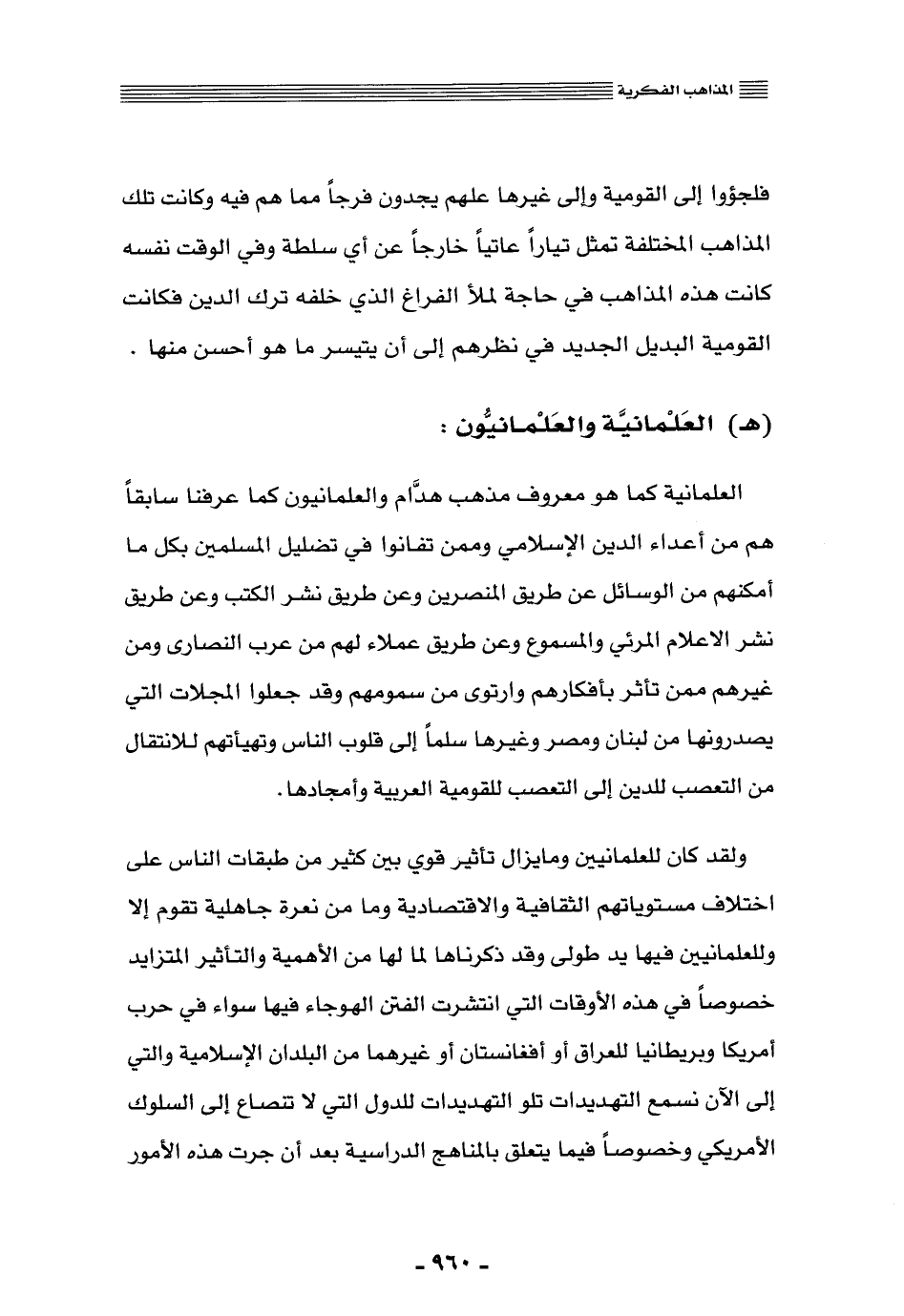 العلمانية كما هو معروف مذهب هدَّام, والعلمانيون كما عرَّفنا سابقًا هم من أعداء الدين الإسلامي, وممن تفانوا في تضليل المسلمين بكلّ ما أمكنهم من الوسائل عن طريق المنصِّرين, وعن طريق نشر الكتب, وعن طريق نشر الإعلام المرئيّ والمسموع, وعن طريق عملاء لهم من عرب النصارى ومن غيرهم ممن تأثَّر بأفكارهم وارتوَى من سمومهم, وقد جعلوا المجلات التي يصدِّرونها من لبنان ومصر وغيرها سلَّمًا إلى قلوب الناس, وتهيأتهم للانتقال من التعصُّب للدين إلى التعصُّب للقومية العربية وأمجادها.