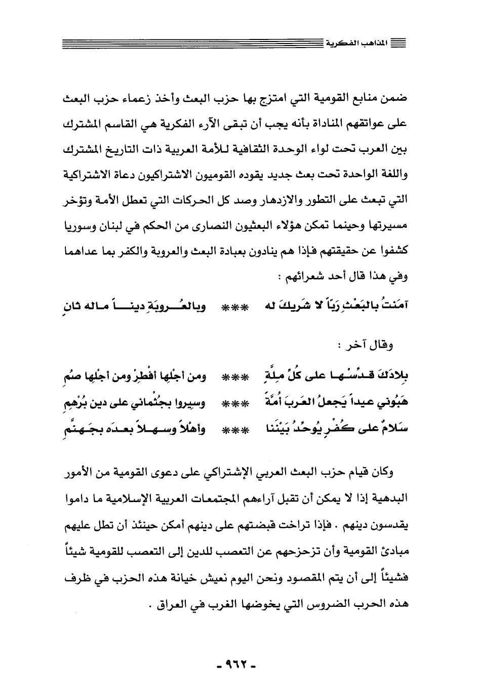 وكان قيام حزب البعث العربي الاشتراكي على دعوى القومية من الأمور البدهية؛ إذ لا يمكن أن تقبل آراءهم المجتمعات العربية الإسلامية ما داموا يقدّسون دينهم, فإذا تراخت قبضتهم على دينهم أمكن حينئذ أن تطل عليهم مبادئ القومية وأن تزحزحهم عن التعصب للدين إلى التعصب للقومية شيئًا فشيئًا, إلى أن يتمَّ المقصود, ونحن اليوم نعيش خيانة هذا الحزب في ظرف هذه الحرب الضروس التي يخوضها الغرب في العراق.