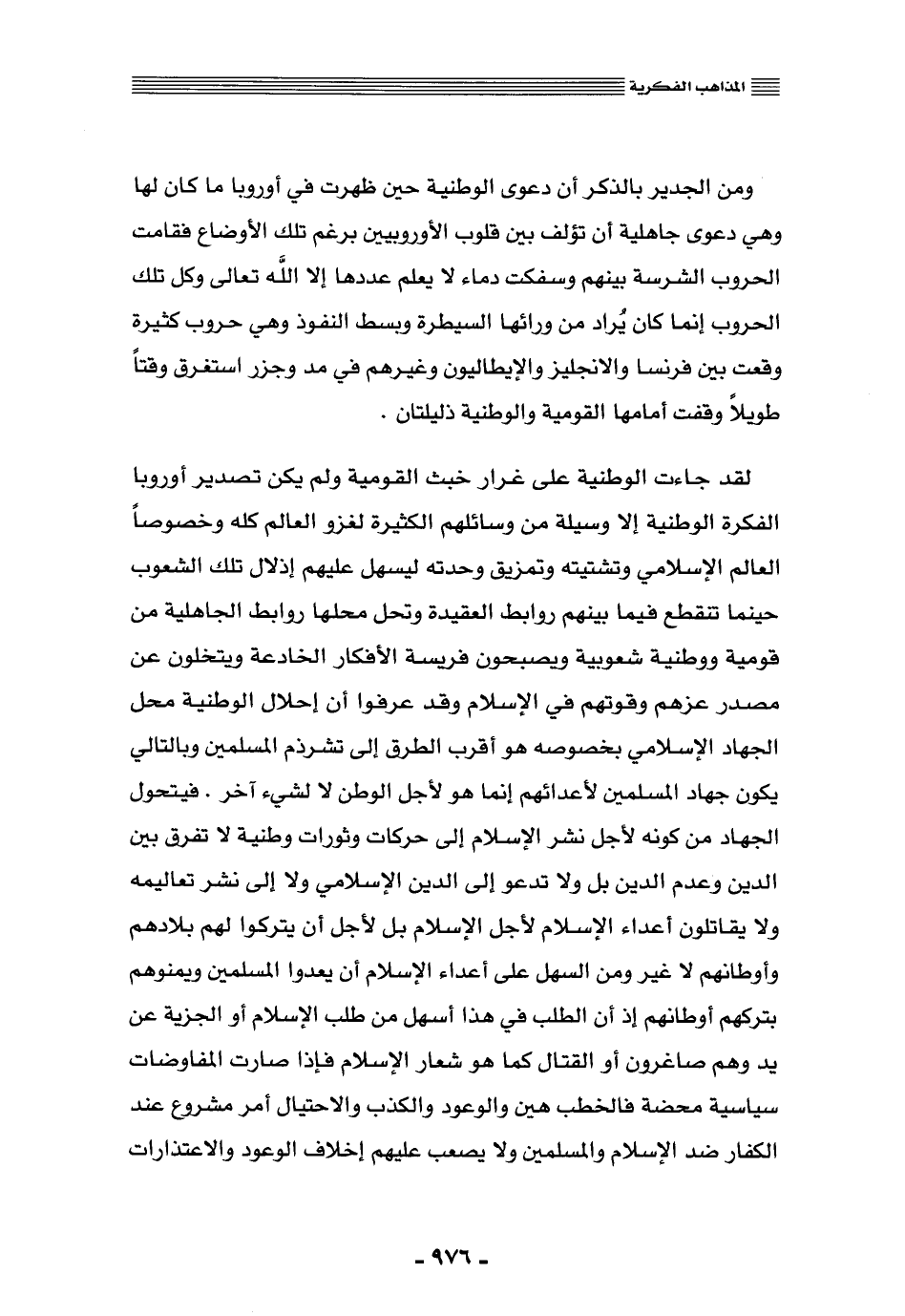 لقد جاءت الوطنية على غرار خبث القومية, ولم يكن تصدير أوروبا الفكرة الوطنية إلّا وسيلة من وسائلهم الكثيرة لغزو العالم كله, وخصوصًا العالم الإسلامي, وتشتيته وتمزيق وحدته؛ ليسهل عليهم إذلال تلك الشعوب حينما تنقطع فيما بينهم روابط العقيدة, وتحل محلها روابط الجاهلية من قومية ووطنية شعوبية, ويصبحون فريسة الأفكار الخادعة, ويتخلَّون عن مصدر عزهم وقوتهم في الإسلام, وقد عرفوا أن إحلال الوطنية محلّ الجهاد الإسلامي بخصوصه هو أقرب الطرق إلى تشرذم المسلمين, وبالتالي يكون جهاد المسلمين لأعدائهم إنما هو لأجل الوطن لا لشيء آخر, فيتحول الجهاد من كونه لأجل نشر الإسلام إلى حركات ثورات وطنية لا تفرِّق بين الدين وعدم الدين, بل ولا تدعو إلى الدين الإسلامي ولا إلى نشر تعاليمه, ولا يقاتلون أعداء الإسلام لأجل الإسلام, بل لأجل أن يتركوا لهم بلادهم وأوطانهم لا غير, ومن السهل على أعداء الإسلام أن يعِدُوا المسلمين ويمنوهم بتركهم أوطانهم؛ إذ أن الطلب في هذا أسهل من طلب الإسلام أو الجزية عن يد وهم صاغرون أو القتال كما هو شعار الإسلام, فإذا صارت المفاوضات سياسية محضة فالخطب هيّن, والوعود والكذب والاحتيال أمر مشروع عند الكفار ضد الإسلام والمسلمين, ولا يصعب عليهم إخلاف الوعود والاعتذارات