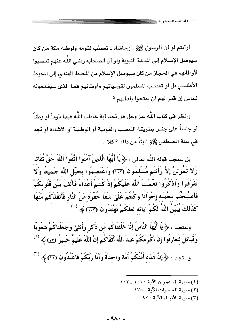 أرأيتم لو أن الرسول -صلى الله عليه وسلم- وحاشاه- تعصَّب لقومه ولوطنه مكة, من كان سيوصل الإسلام إلى المدينة النبوية, ولو أن الصحابة -رضي الله عنهم- تعصَّبوا لأوطانهم في الحجاز, من كان سيوصل الإسلام من المحيط الهندي إلى المحيط الأطلسي, بل لو تعصَّب المسلمون لقوميَّاتهم وأوطانهم, فما الذي سيقدمونه للناس إن قدر لهم أن يفتحوا بلدانهم؟