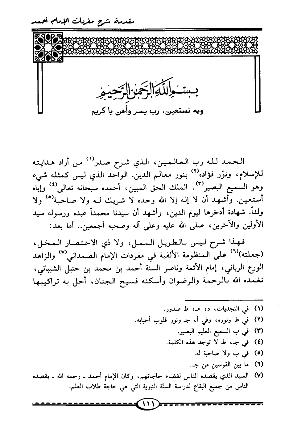 فهذا شرح ليس بالطويل الممل، ولا ذي الاختصار المخل، (جعلته) (¬6) على المنظومة الألفية في مفردات الإمام الصمداني (¬7) والزاهد الورع الرباني، إمام الأئمة وناصر السنة أحمد بن محمد بن حنبل الشيباني، تغمده الله بالرحمة والرضوان وأسكنه فسيح الجنان، أحل به تراكيبها