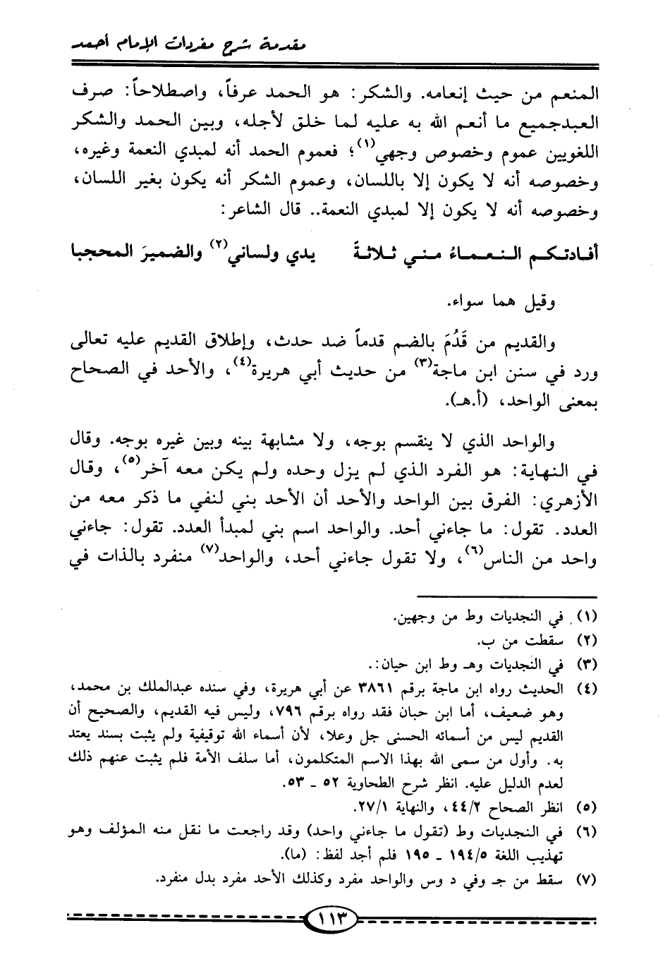 والقديم من قَدُمَ بالضم قدمًا ضد حدث، وإطلاق القديم عليه تعالى ورد في سنن ابن ماجة (¬3) من حديث أبي هريرة (¬4)، والأحد في الصحاح بمعنى الواحد، (أ. هـ).