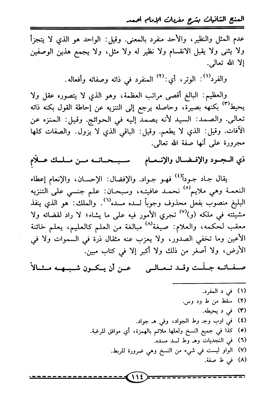 يقال جاد جودًا (¬4) فهو جواد. والإفضال: الإحسان، والإنعام إعطاء النعمة وهي ملايم (¬5) نحمد عافيته، وسبحان: علم جنسي على التنزيه البليغ منصوب بفعل محذوف وجوبًا لسده مسده (¬6). والملك: هو الذي ينفذ مشيئته في ملكه (و) (¬7) تجري الأمور فيه على ما يشاءة لا راد لقضائه ولا معقب لحكمه، والعلام: صيغة (¬8) مبالغة من العلم كالعليم، يعلم خائنة الأعين وما تخفي الصدور، ولا يعزب عنه مثقال ذرة في السموات ولا في الأرض، ولا أصغر من ذلك ولا أكبر إلا في كتاب مبين.
