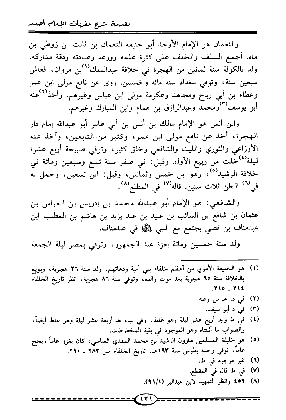 والنعمان هو الإمام الأوحد أبو حنيفة النعمان بن ثابت بن زوطى بن ماه. أجمع السلف والخلف على كثرة علمه وورعه وعبادته ودقة مداركه. ولد بالكوفة سنة ثمانين من الهجرة في خلافة عبد الملك (¬1) بن مروان، فعاش سبعين سنة، وتوفي ببغداد سنة مائة وخمسين. روى عن نافع مولى ابن عمر وعطاء بن أبي رباح ومجاهد وعكرمة مولى ابن عباس وغيرهم. وأخذ (¬2) عنه أبو يوسف (¬3) ومحمَّد وعبد الرازق بن همام وابن المبارك وغيرهم.