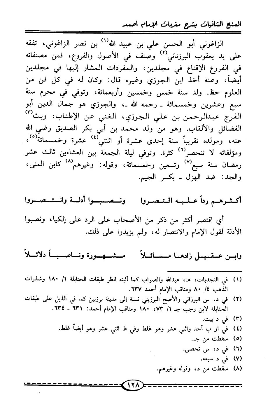 الزاغوني أبو الحسن علي بن عبيد الله (¬1) بن نصر الزاغوني، تفقه على يد يعقوب البرزناني (¬2) وصنف في الأصول والفروع، فمن مصنفاته في الفروع الإقناع في مجلدين، والمفردات المشار إليها في مجلدين أيضًا، وعنه أخذ ابن الجوزي وغيره قال: وكان له في كل فن من العلوم حظ. ولد سنة خمس وخمسين وأربعمائة، وتوفي في محرم سنة سبع وعشرين وخمسمائة -رحمه الله-، والجوزي هو جمال الدين أبو الفرج عبد الرحمن بن علي الجوزي، الغني عن الإطناب، وبث (¬3) الفضائل والألقاب. وهو من ولد محمد بن أبي بكر الصديق رضي الله عنه، ومولده تقريبًا سنة إحدى عشرة أو اثنتي (¬4) عشرة وخمسمائة (¬5)، ومؤلفاته لا تنحصر (¬6) كثرة. وتوفي ليلة الجمعة بين العشاءين ثالث عشر رمضان سنة سبع (¬7) وتسعين وخمسمائة، وقوله: وغيرهم (¬8) كابن المنى، والجد: ضد الهزل - بكسر الجيم.