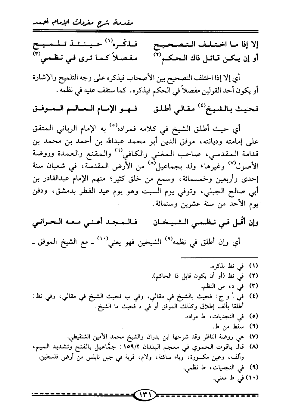 أي حيث أطلق الشيخ في كلامه فمراده (¬5) به الإمام الرباني المتفق على إمامته وديانته، موفق الدين أبو محمد عبد الله بن أحمد بن محمد بن قدامة المقدسي، صاحب المغني والكافي (¬6) والمقنع والعمدة وروضة الأصول (¬7) وغيرها؛ ولد بجماعيل (¬8) من الأرض المقدسة، في شعبان سنة إحدى وأربعين وخمسمائة، وسمع من خلق كثير. منهم الإمام عبد القادر بن أبي صالح الجيلي، وتوفي يوم السبت وهو يوم عيد الفطر بدمشق، ودفن يوم الأحد من سنة عشرين وستمائة.