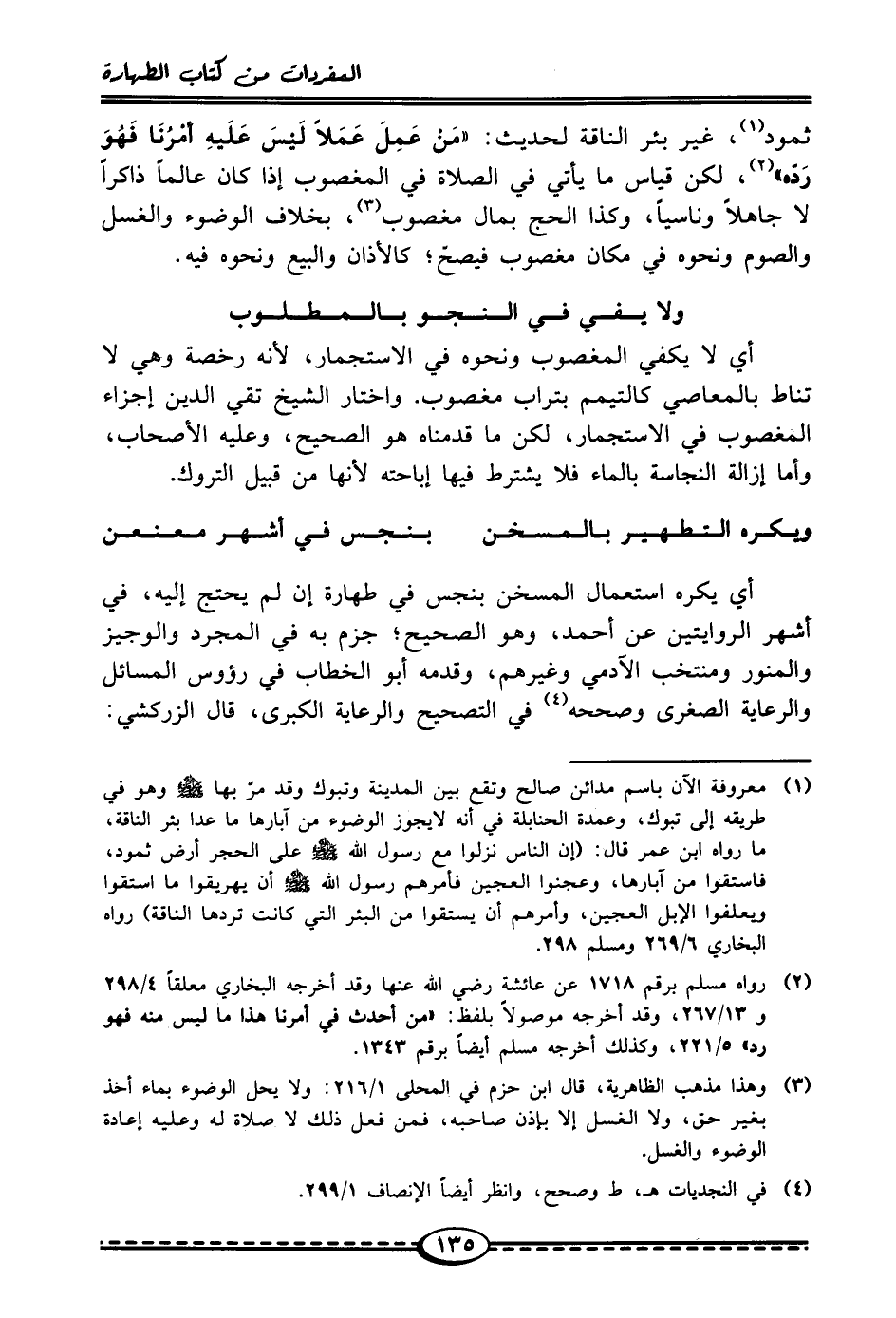 (¬1) معروفة الآن باسم مدائن صالح وتقع بين المدينة وتبوك وقد مرّ بها - صلى الله عليه وسلم - وهو في طريقه إلى تبوك، وعمدة الحنابلة في أنه لا يجوز الوضوء من آبارها ما عدا بئر الناقة، ما رواه ابن عمر قال: (إن الناس نزلوا مع رسول الله - صلى الله عليه وسلم - على الحجر أرض ثمود، فاستقوا من آبارها، وعجنوا العجين فأمرهم رسول الله - صلى الله عليه وسلم - أن يهريقوا ما استقوا ويعلفوا الإبل العجين، وأمرهم أن يستقوا من البئر التي كانت تردها الناقة) رواه البخاري 6/ 269 ومسلمٌ 298.