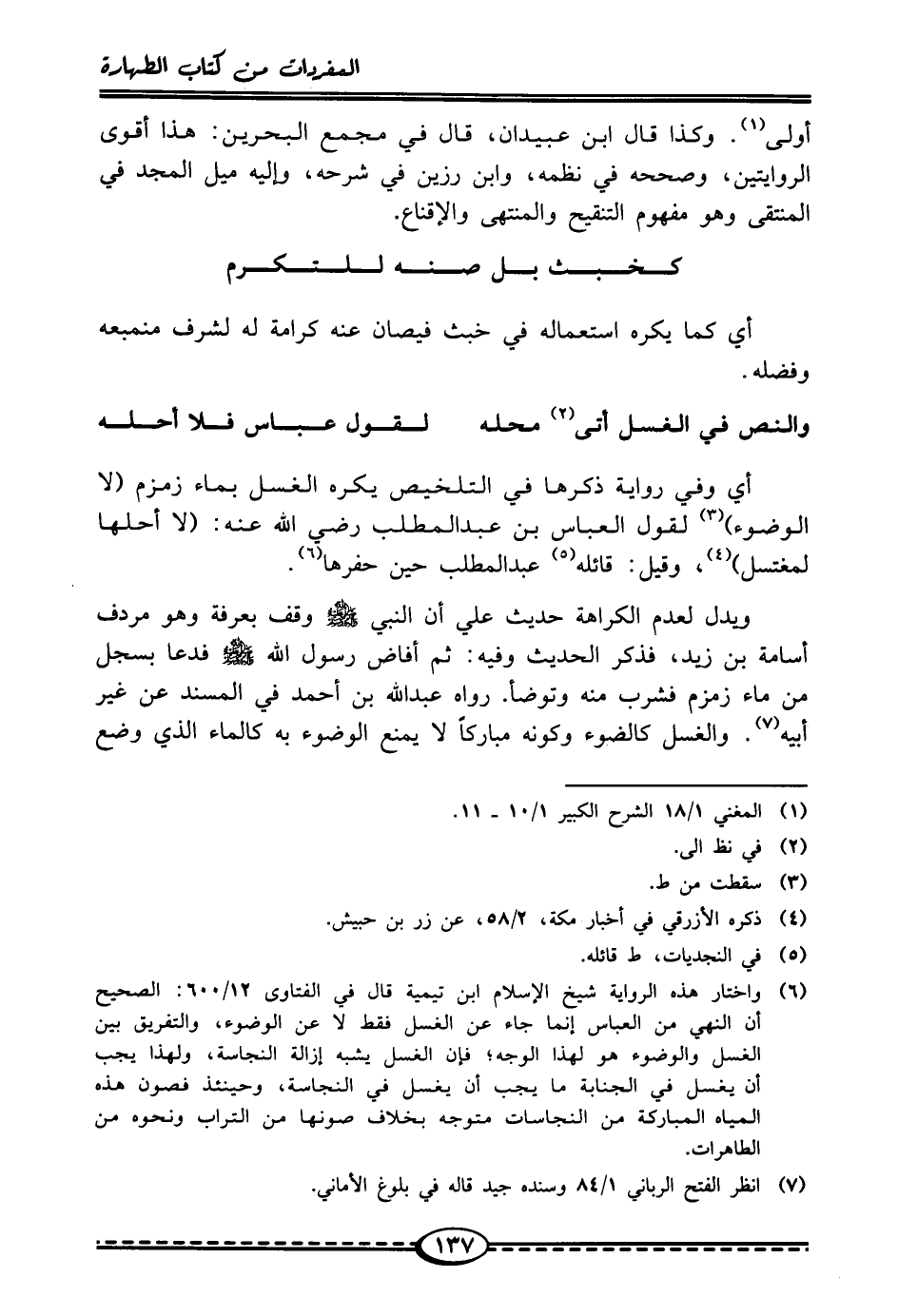 (¬6) واختار هذه الرواية شيخ الإسلام ابن تيمية قال في الفتاوى 12/ 600: الصحيح أن النهي من العباس إنما جاء عن الغسل فقط لا عن الوضوء، والتفريق بين الغسل والوضوء هو لهذا الوجه؛ فإن الغسل يشبه إزالة النجاسة، ولهذا يجب أن يغسل في الجنابة ما يجب أن يغسل في النجاسة، وحينئذ فصون هذه المياه المباركة من النجاسات متوجه بخلاف صونها من التراب ونحوه من الطاهرات.