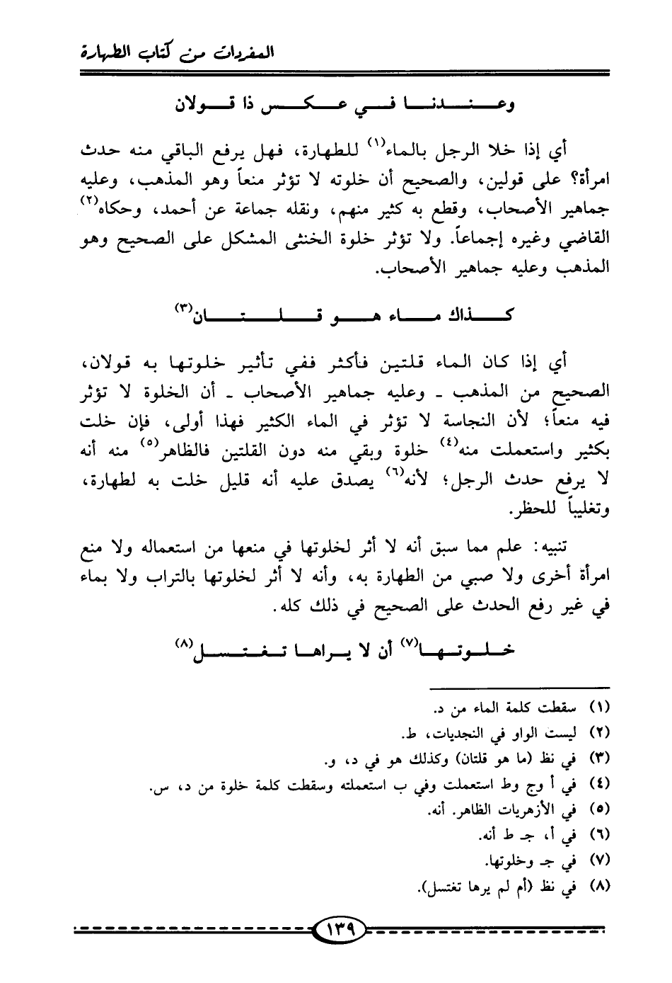 أي إذا كان الماء قلتين فأكثر ففي تأثير خلوتها به قولان، الصحيح من المذهب -وعليه جماهير الأصحاب- أن الخلوة لا تؤثر فيه منعًا؛ لأن النجاسة لا تؤثر في الماء الكثير فهذا أولى، فإن خلت بكثير واستعملت منه (¬4) خلوة وبقي منه دون القلتين فالظاهر (¬5) منه أنه لا يرفع حدث الرجل؛ لأنه (¬6) يصدق عليه أنه قليل خلت به لطهارة، وتغليبًا للحظر.