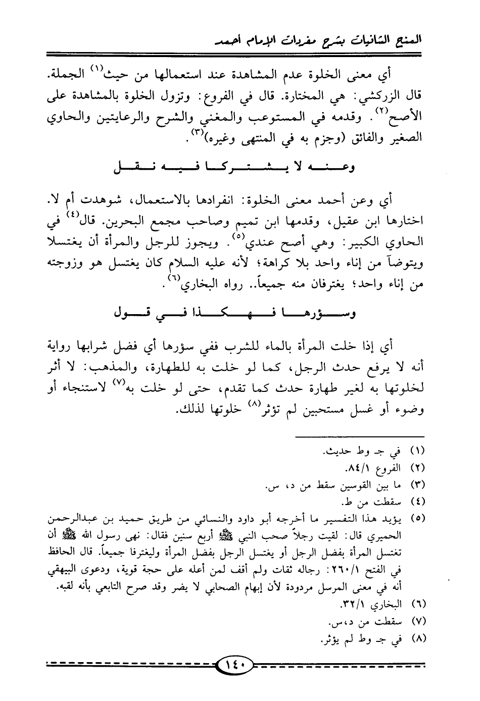 أي وعن أحمد معنى الخلوة: انفرادها بالاستعمال، شوهدت أم لا. اختارها ابن عقيل، وقدمها ابن تميم وصاحب مجمع البحرين. قال (¬4) في الحاوي الكبير: وهي أصح عندي (¬5). ويجوز للرجل والمرأة أن يغتسلا ويتوضآ من إناء واحد بلا كراهة؛ لأنه -عليه السلام- كان يغتسل هو وزوجته من إناء واحد؛ يغترفان منه جميعًا .. رواه البخاري (¬6).