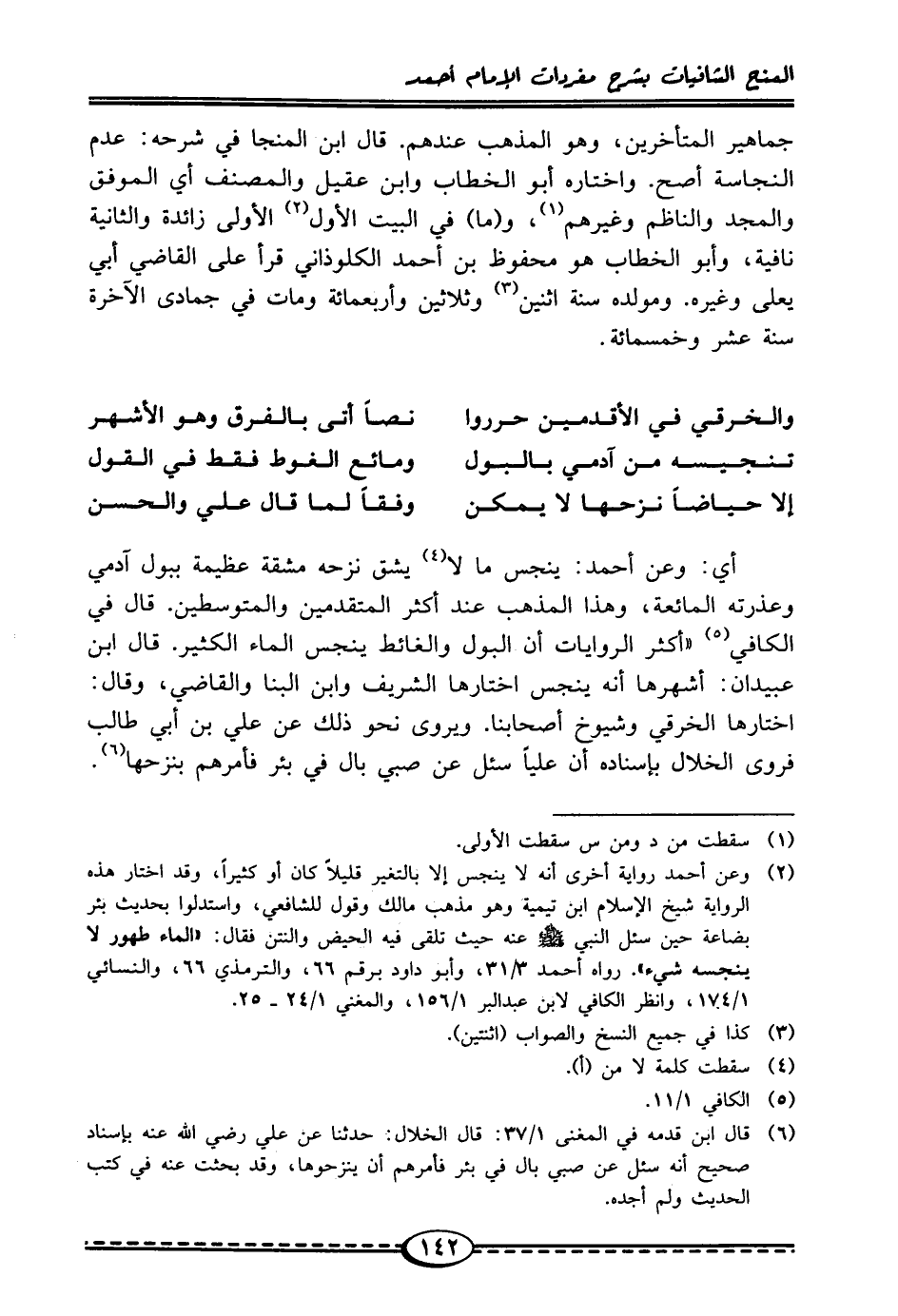 (¬6) قال ابن قدمه في المغنى 1/ 37: قال الخلال: حدثنا عن علي -رضي الله عنه- بإسناد صحيح أنه سئل عن صبي بال في بئر فأمرهم أن ينزحوها، وقد بعثت عنه في كتب الحديث ولم أجده.