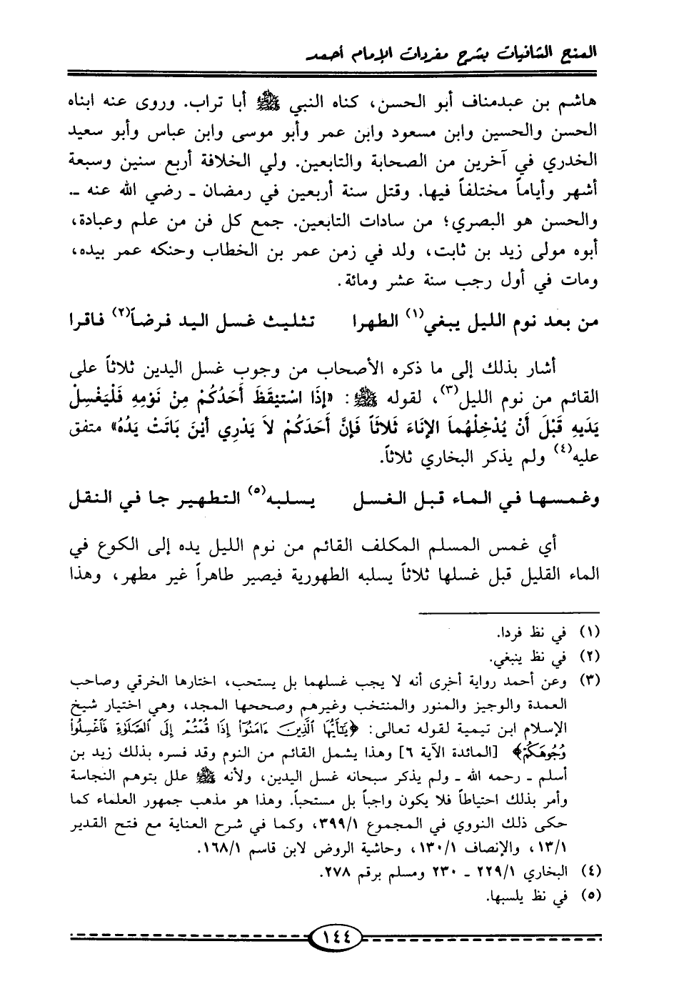 (¬3) وعن أحمد رواية أخرى أنه لا يجب غسلهما بل يستحب، اختارها الخرقي وصاحب العمدة والوجيز والمنور والمنتخب وغيرهم وصححها المجد، وهي اختيار شيخ الإسلام ابن تيمية لقوله تعالى: {يَاأَيُّهَا الَّذِينَ آمَنُوا إِذَا قُمْتُمْ إِلَى الصَّلَاةِ فَاغْسِلُوا وُجُوهَكُمْ} [المائدة الآية 6] وهذا يشمل القائم من النوم وقد فسره بذلك زيد بن أسلم -رحمه الله- ولم يذكر سبحانه غسل اليدين، ولأنه - صلى الله عليه وسلم - علل بتوهم النجاسة وأمر بذلك احتياطًا فلا يكون واجبًا بل مستحبًا. وهذا هو مذهب جمهور العلماء كما حكى ذلك النووي في المجموع 1/ 399، وكما في شرح العناية مع فتح القدير 1/ 13، والإنصاف 1/ 130، وحاشية الروض لابن قاسم 1/ 168.