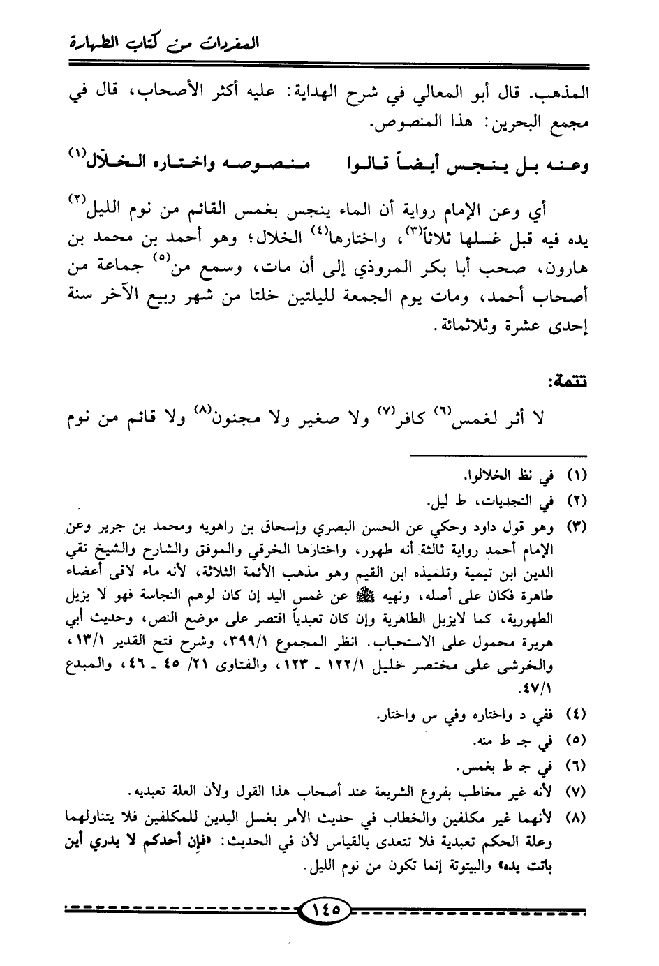 (¬3) وهو قول داود وحكي عن الحسن البصري وإسحاق بن راهويه ومحمَّد بن جرير وعن الإمام أحمد رواية ثالثة أنه طهور، واختارها الخرقي والموفق والشارح والشيخ تقي الدين ابن تيمية وتلميذه ابن القيم وهو مذهب الأئمة الثلاثة؛ لأنه ماء لاقى أعضاء طاهرة فكان على أصله، ونهيه - صلى الله عليه وسلم - عن غمس اليد إن كان لوهم النجاسة فهو لا يزيل الطهورية، كما لا يزيل الطاهرية وإن كان تعبديًا اقتصر على موضع النص، وحديث أبي هريرة محمول على الاستحباب. انظر المجموع 1/ 399، وشرح فتح القدير 1/ 13، والخرشى على مختصر خليل 1/ 122 - 123، والفتاوى 21/ 45 - 46، والمبدع 1/ 47.