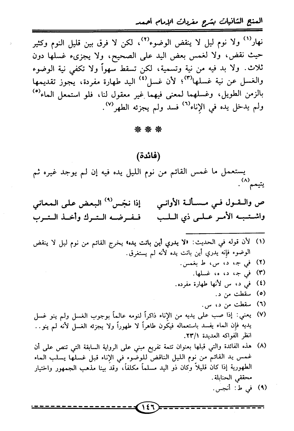 (¬8) هذه الفائدة والتي قبلها بعنوان تتمة تفريع مبني على الرواية السابقة التي تنص على أن غمس يد القائم من نوم الليل الناقض للوضوء في الإِناء قبل غسلها يسلب الماء الطهورية إذا كان قليلًا وكان ذو اليد مسلمًا مكلفًا، وقد بينا مذهب الجمهور واختيار محققي الحنابلة.
