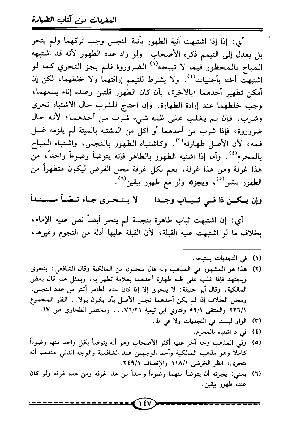 (¬2) هذا هو المشهور في المذهب وبه قال سحنون من المالكية وقال الشافعي: يتحرى ويجتهد فإذا غلب على ظنه طهارة أحدهما بعلامة تطهير به، وبمثل هذا قال بعض المالكية، وقال أبو حنيفة: لا يتحرى إلا إذا كان عدد الطاهر أكثر من عدد النجس، ومحل الخلاف إذا لم يكن أحدهما نجس الأصل بأن يكون بولا .. انظر المجموع 1/ 226 والمتتقى 1/ 59 وفتاوي ابن تيمية 21/ 76، .. ومختصر الطحاوي ص 17.