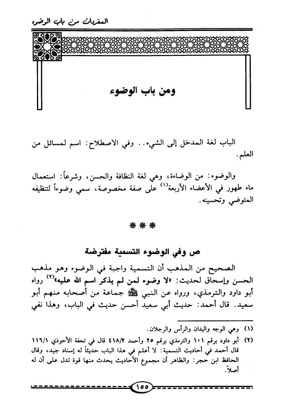(¬2) أبو داود برقم 101 والترمذيُّ برقم 25 وأحمدُ 2/ 418 قال في تحفة الأحوذي 1/ 116 قال أحمد في أحاديث التسمية: لا أعلم في هذا الباب حديثًا له إسناد جيد، وقال الحافظ ابن حجر: والظاهر أن مجموع الأحاديث يحدث منها قوة تدل على أن له أصلًا.